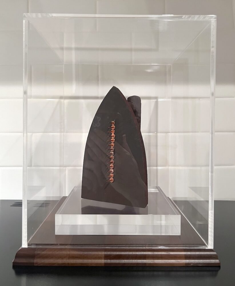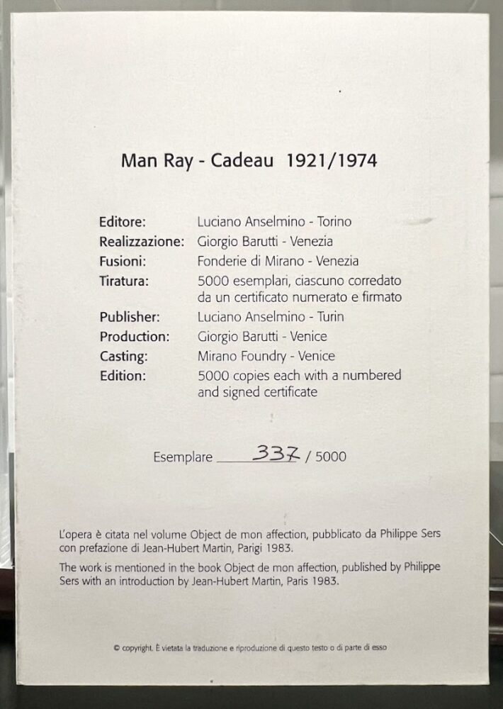 An iconic and historic work of art, Man Ray’s Le Cadeau (“The Gift”), is an early ready-made created by the artist in 1921 during his Dada period. Typical of the perverse, subversive inclinations of the Dada movement, the piece was so popular – such a brilliant example of the surreal, useless object – that Man Ray revisited it throughout his career, finally creating a full edition in 1974, shortly before his death. Created of cast iron, the sculpture is stamped with the artist’s signature and the edition number on its handle, measures 6 ½ x 4 x 3 ½ in (16.5 x10.2 x 8.9 cm) and is from the edition of 5000. Published by Luciano Anselmino, Turin; cast by the Mirano Foundry, Venice; produced by Giorgio Barutti, Venice. Please note the first image is two views of a single object. Included are the initialed and numbered printed plastic justification card, paper documentation, casing, and box, as well as a plexi and wood display case.