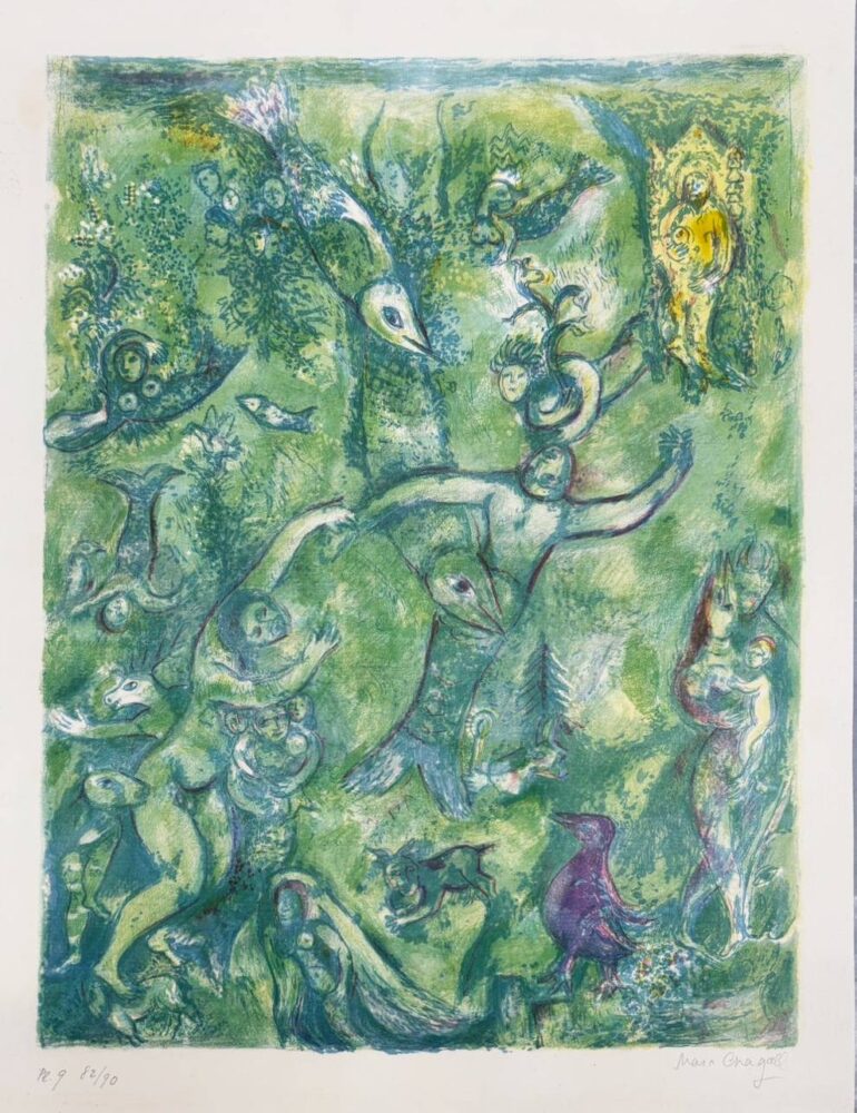 Chagall interprets this scene with simple, flowing forms and soft tonal contrasts rather than literal depiction. His approach conveys the unusual atmosphere of the underwater world and the sense of movement described in the narrative. The result is an image that reflects both the story’s content and Chagall’s personal way of translating narrative into visual terms.