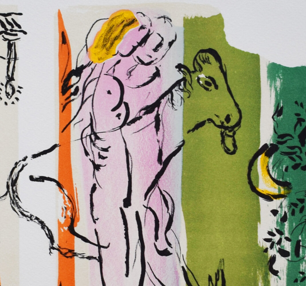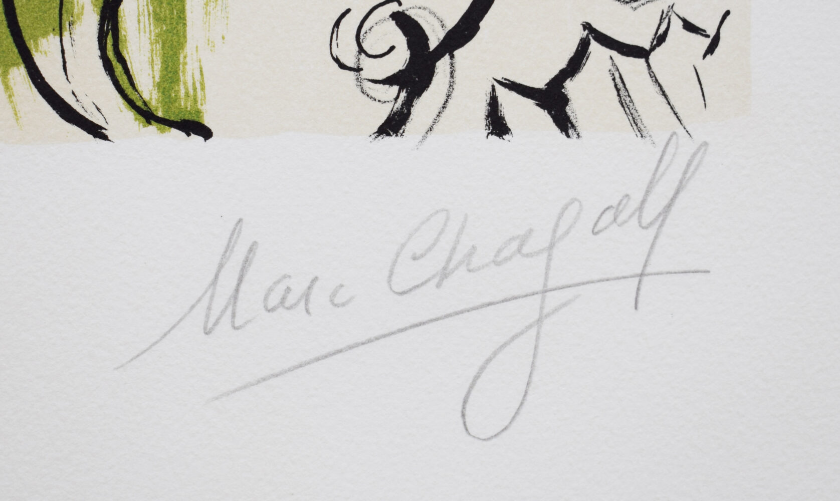 This original lithograph in colours is hand signed in pencil by the artist “Marc Chagall” at the lower right margin.