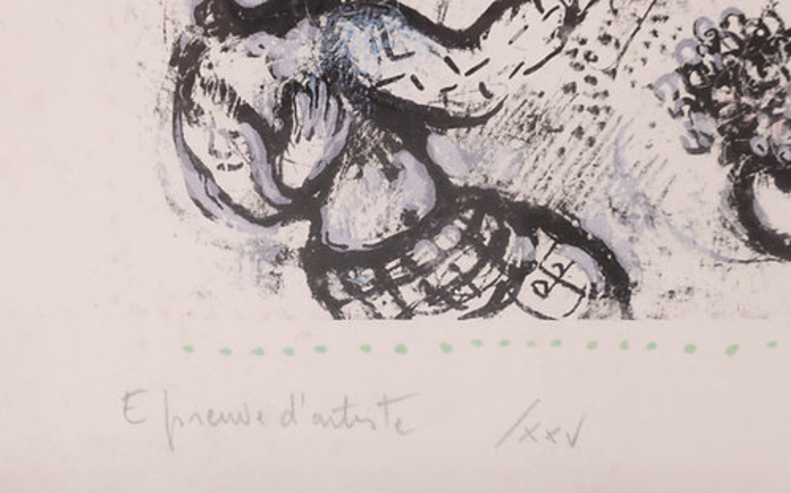 A coloured lithograph printed on Arches wove paper, Marc Chagall’s ‘Les Saltimbanques’ captures the lively and vibrant world of circus performers, a classic motif in his body of work that blends both joy and nostalgia. The print features acrobats and dancers in a dreamlike composition, adorned with patches of red, blue, green and yellow, to convey a sense of vibrancy and emotion. ‘Les Saltimbanques’ is a striking example of Chagall’s ability to blend reality with surrealism, inviting viewers into a world where the everyday is reimagined into the magical.