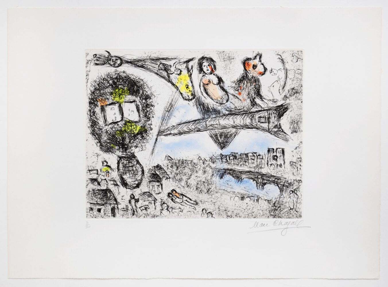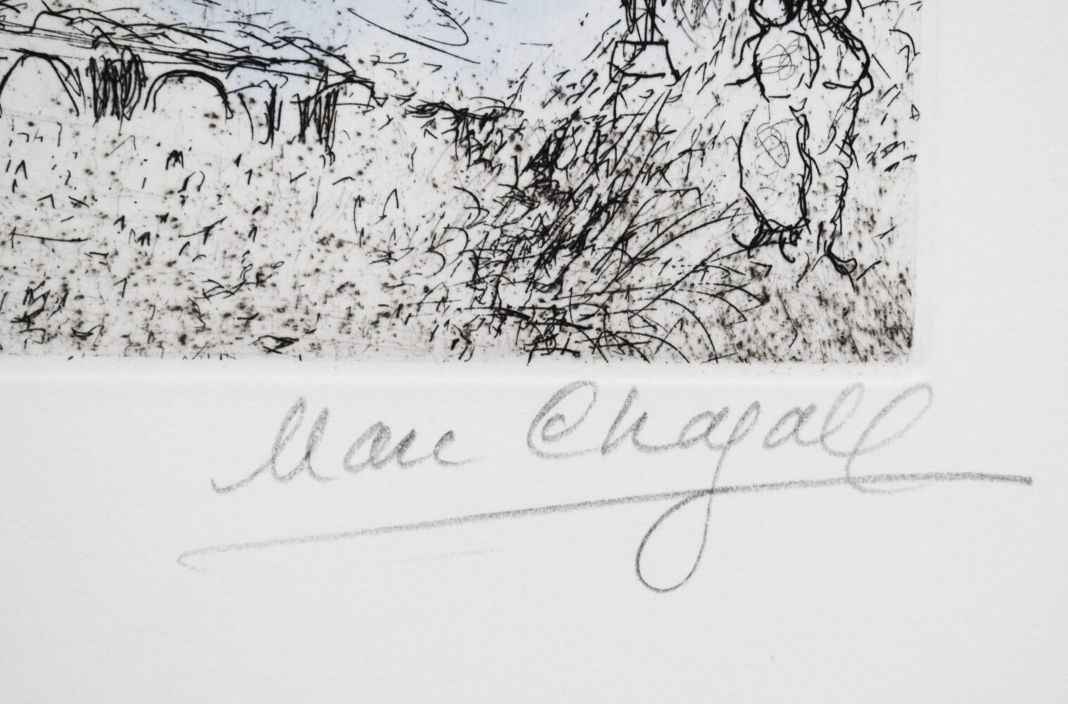 This original etching and aquatint in colours is hand signed in pencil by the artist “Marc Chagall” at the lower right margin.