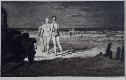 Tree, Manhattan is a tour de force print demonstrating Lewis’s mastery of drypoint. Hues range from the rich black of the figures in the lower left to the near-white of the fire and the windows in the buildings in the background. The sky is a variegated pattern of intricate cross-hatchings, so it is always alive; a searchlight cuts through the sky toward the left. The great tree is bare, its branches filling the sky; somehow clotheslines have been attached to high reaches of its trunk, thereby tying the tree to its Manhattan empty lot setting.