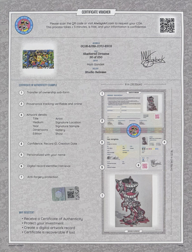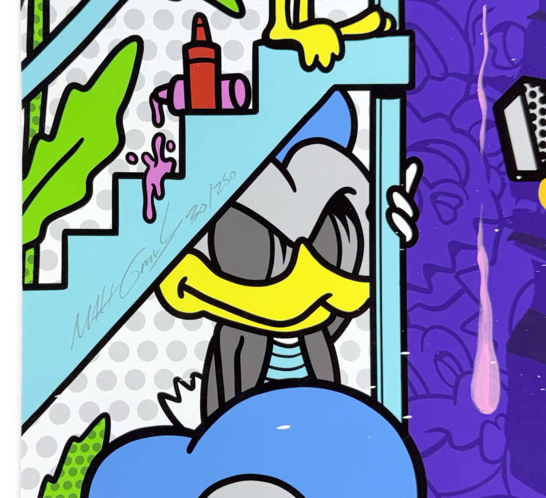 About the Artist: Matt Gondek is a Deconstructive Pop Artist, whose work is possessed with a punk rock spirit, celebrating rebellion and destruction. With a visceral pop color palette and a disarmingly playful tone, he tears down cartoon idols, akin to slaughtering our modern day gods. Born in 1982, his creative voice is rooted in the 90s; as a true conduit of his generation and their potentially pointless search for meaning and purpose amidst a cruel life in a flawed world. He boasts sold out exhibitions in his home of Los Angeles as well as New York, Paris, Bangkok, and Hong Kong.