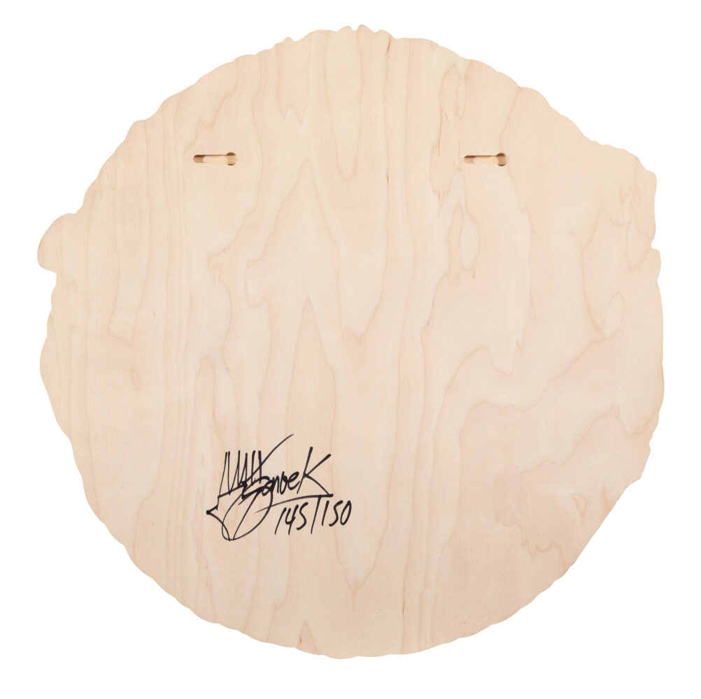 Screen print in colors on shaped wood. Hand signed on verso by Matt Gondek. Hand numbered 145/150 on verso. Artwork size 22.4 inches diameter.