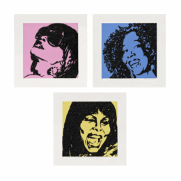 This artwork includes dozens of different collage elements that were each printed and prepared separately before being assembled to create the final composition. It consists of approximately 50 different collage elements total. A wide variety of printmaking techniques were used to create this print including relief, intaglio, lithography, and archival inkjet printing as well as hand applied enamel paint, colored pencil, wood veneer, handmade paper, pearlescent powder, and gold leaf.