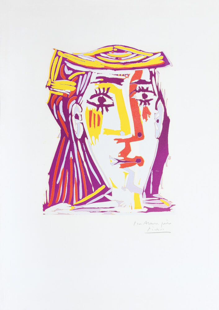This linocut was printed by Hildalgo Arnéra in 1962 as a limited edition run of only 50 prints. This is one of approximately 20 additional artist’s proofs produced, and the significance of this specific proof cannot be overestimated. The print depicts Jacqueline, the last great love of Picasso’s life, and this edition number is signed and inscribed lower left Pour Arnera pére, Picasso, to Arnéra, Picasso’s great mentor and printer. The print thus incorporates arguably the two most significant figures in Picasso’s life at the time – depicting his lover and dedicated to his teacher.