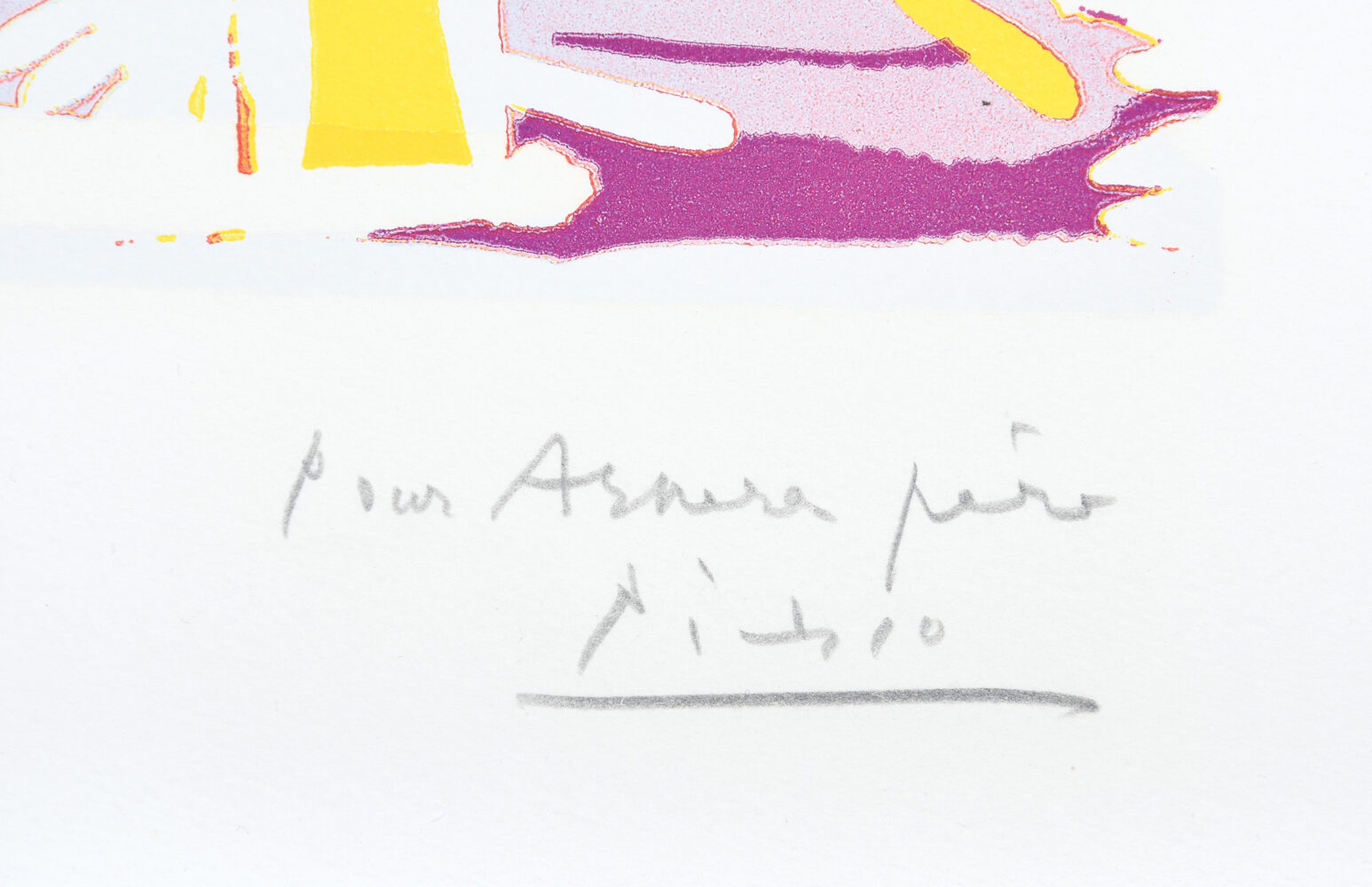 One of approximately 20 artist’s proofs aside from the edition of 50, inscribed and signed in pencil lower right by the artist, Pour Arnera pére, Picasso. The dedicatee is Hildago Arnéra, the printer of this linocut.