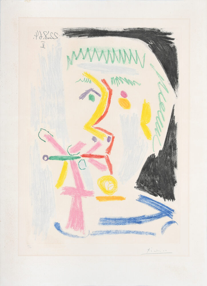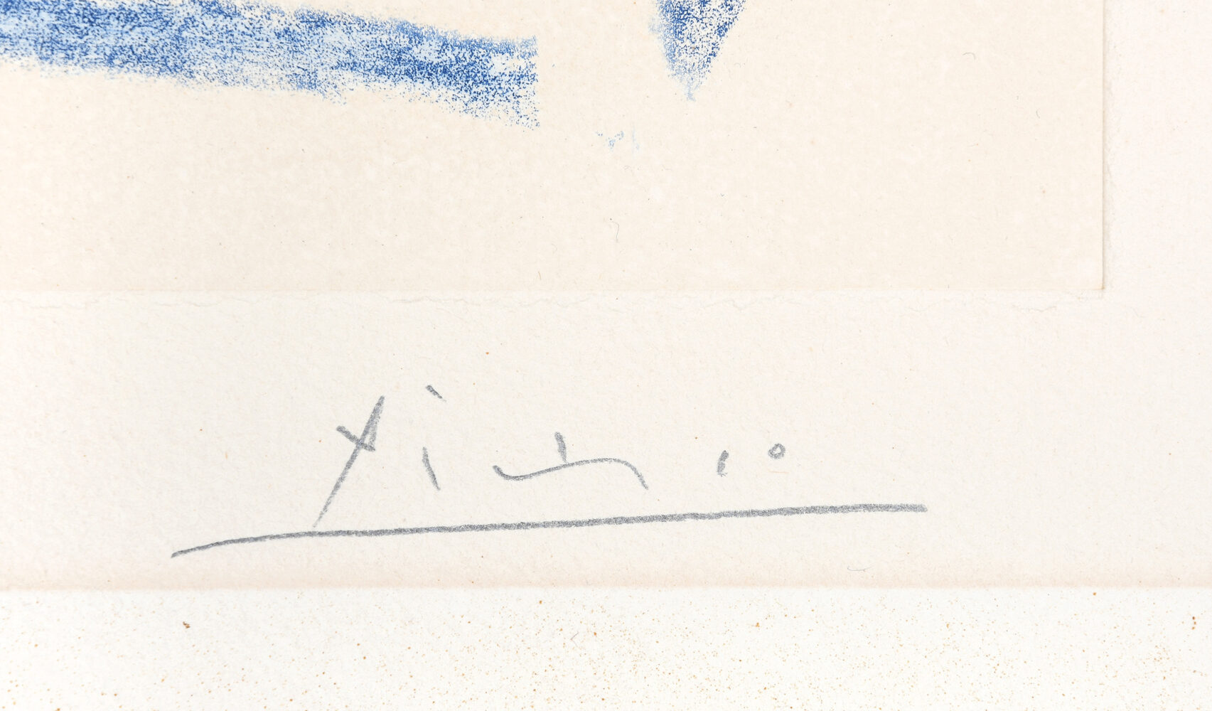Edition of 50. Signed in pencil lower right by Picasso, numbered lower left. Soft ground etching and aquatint in colours on Auverne Richard de Bas watermarked wove paper, all edges untrimmed. Plate size 59.7 x 42.6 cm. Sheet size: 57.6 x 78.6 cm. Framed size: 98 x 78.5 cm.