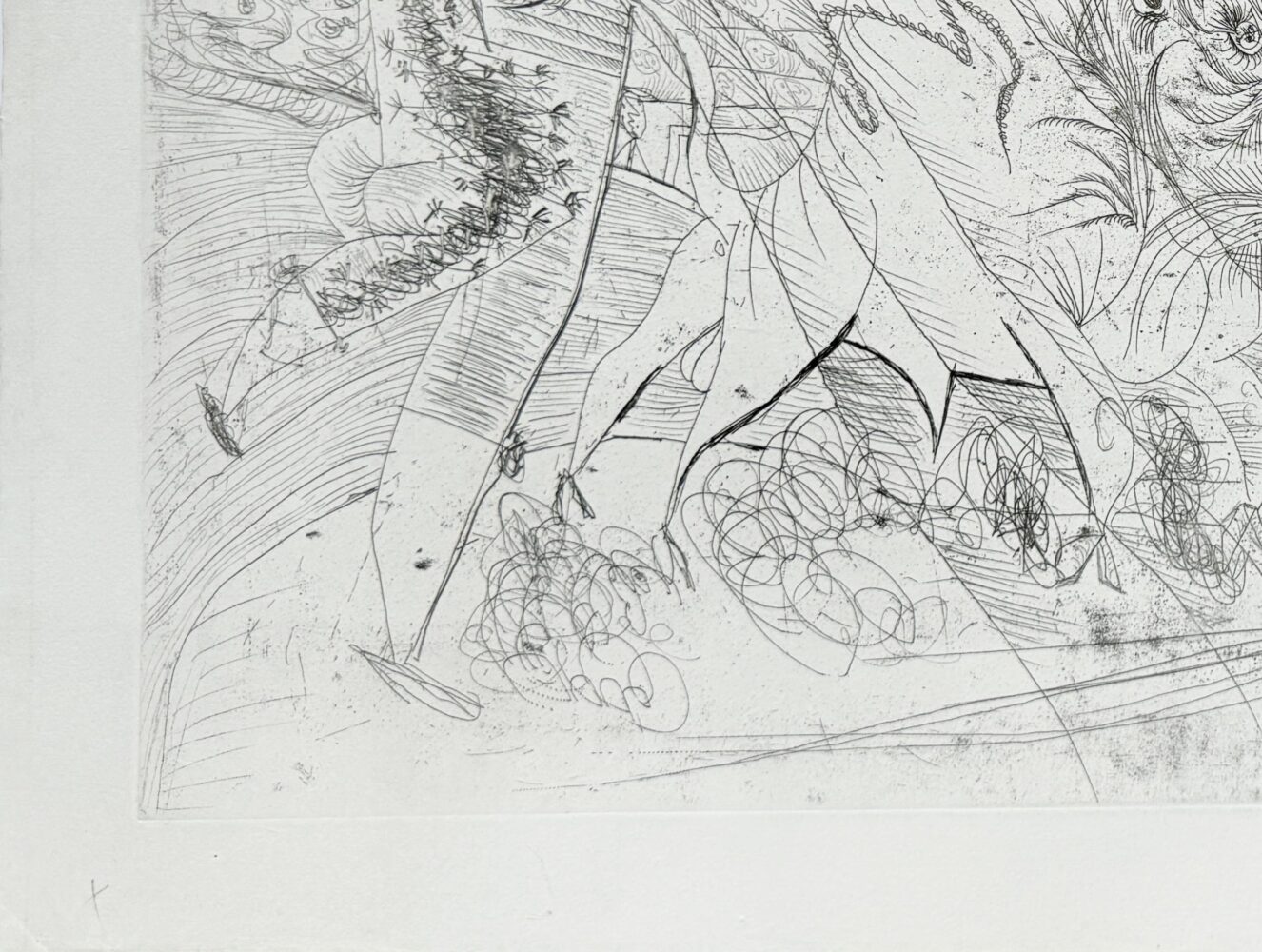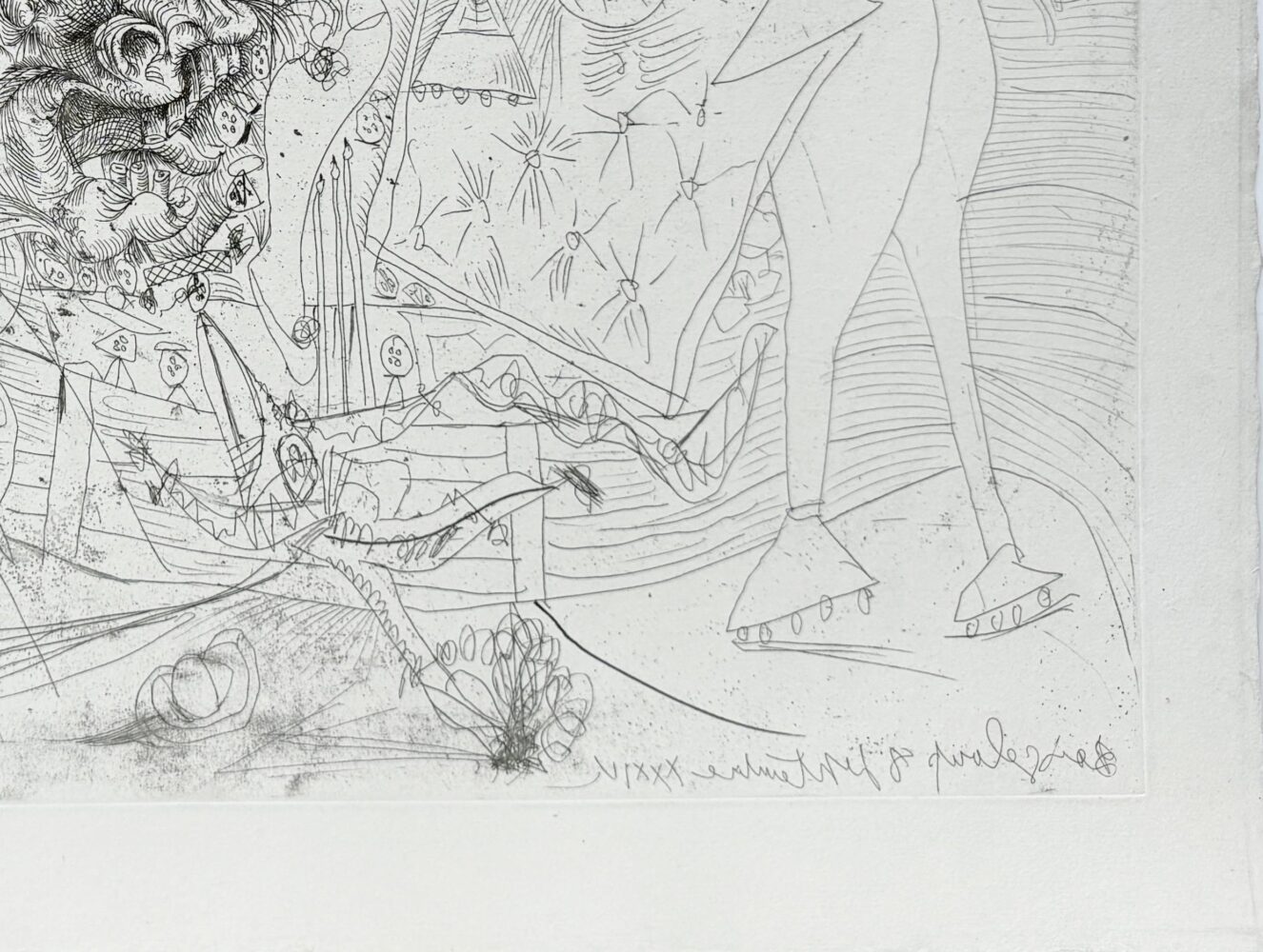 Planned in an edition of fifty by Ambroise Vollard but never completed after his death, only a few impressions were printed and sold by Lacourière, with several signed by Picasso. The work remains a remarkable testament to his mastery of etching and his fascination with passion, struggle, and creation.