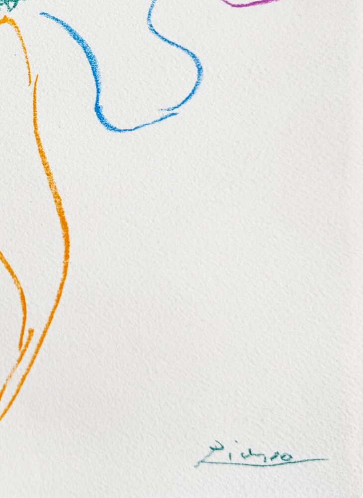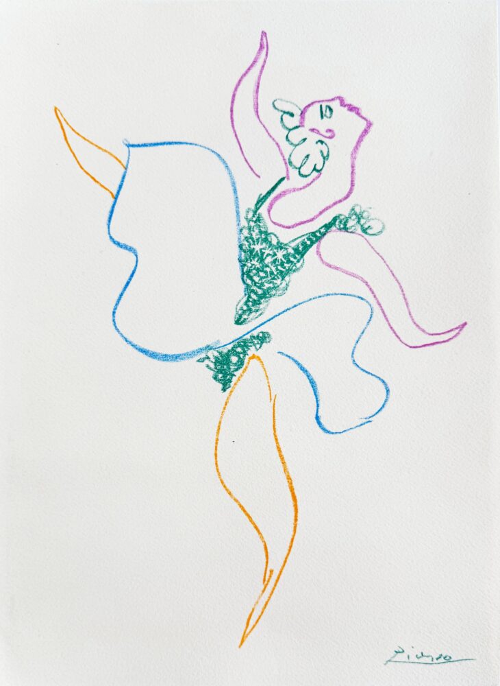Created by Picasso in Vallauris and printed by the renowned Mourlot Frères studio, this lithograph from 1954 features a vibrant dancer in a tutu—a short, stiff skirt made of layered tulle that flares outward to reveal the precision of a dancer’s leg and footwork. With fluid lines and bold color, Picasso captures the elegance and rhythm of ballet in his signature modern style.