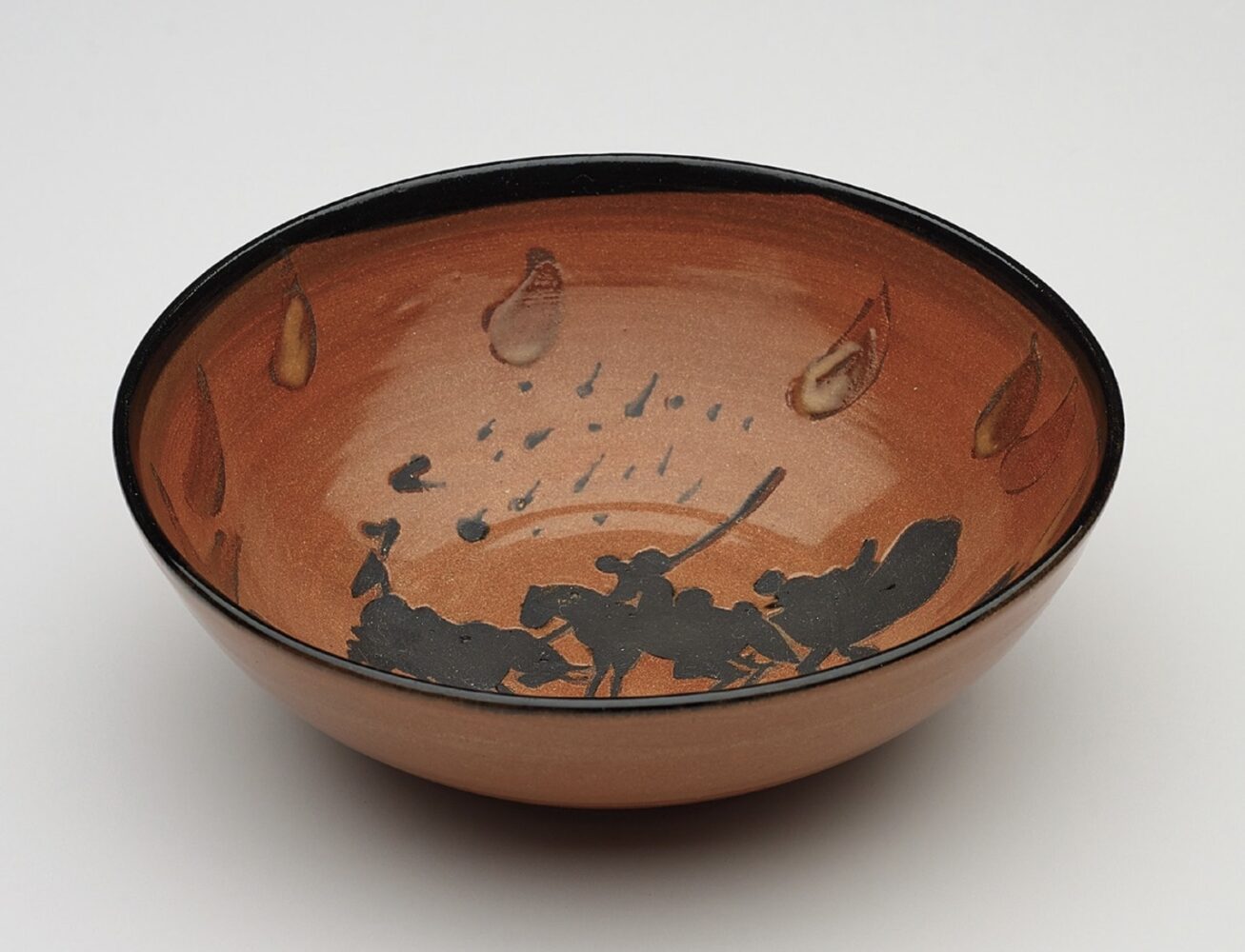Red Earthware Turned Bowl, painted in black with colored engobe and partial brushed glaze