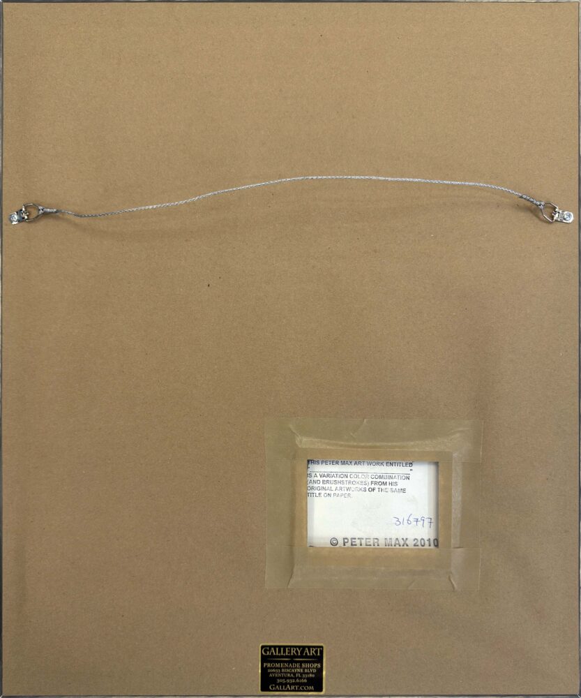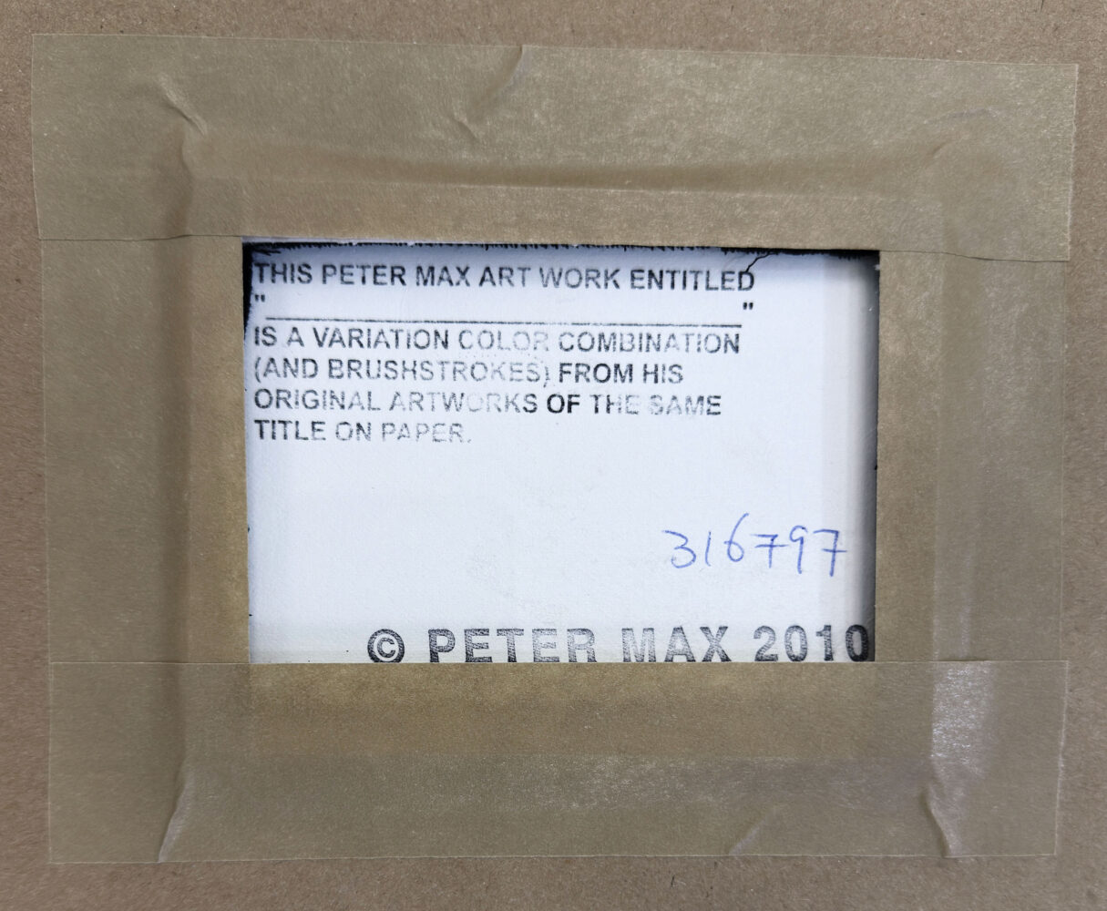 Mixed media with acrylic painting and color lithography on paper. Hand-signed in acrylic paint on front by Peter Max. A unique variation. Artwork size: 16 x 12 inches. Frame size: 24 x 20 inches. Studio stamp with date on verso.