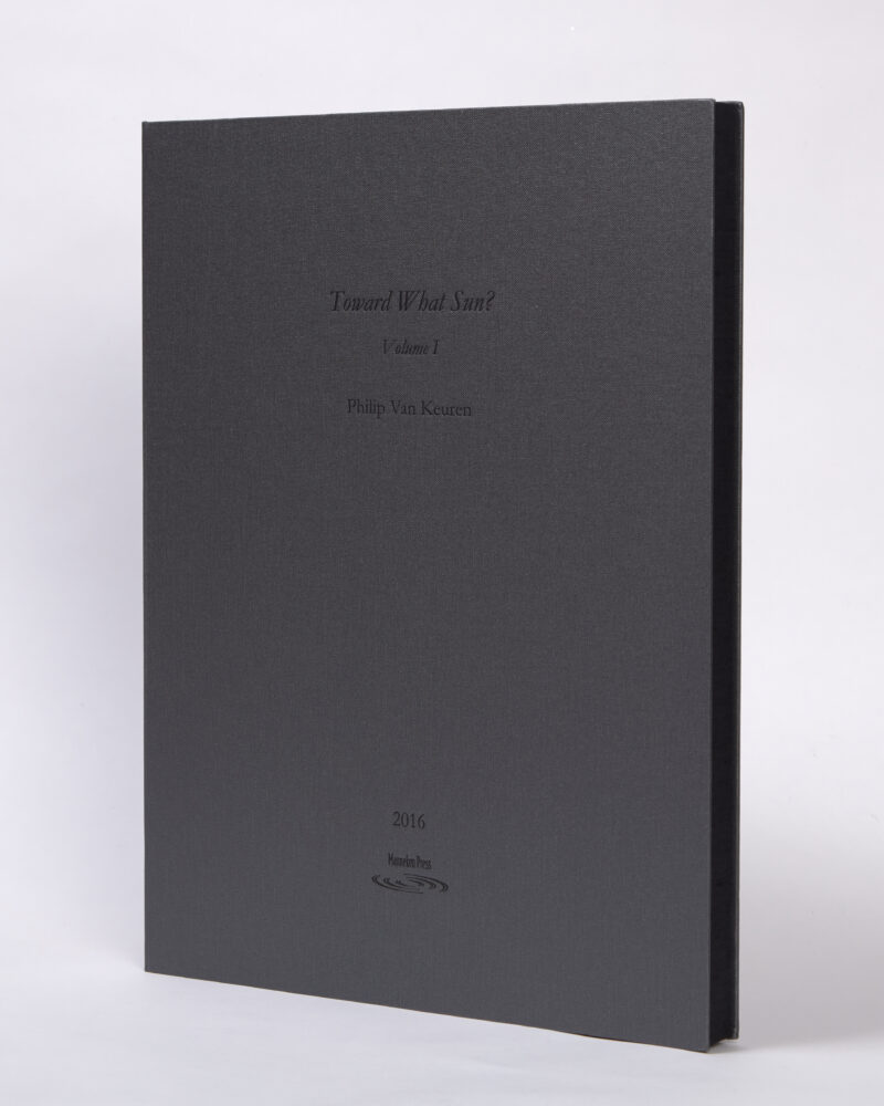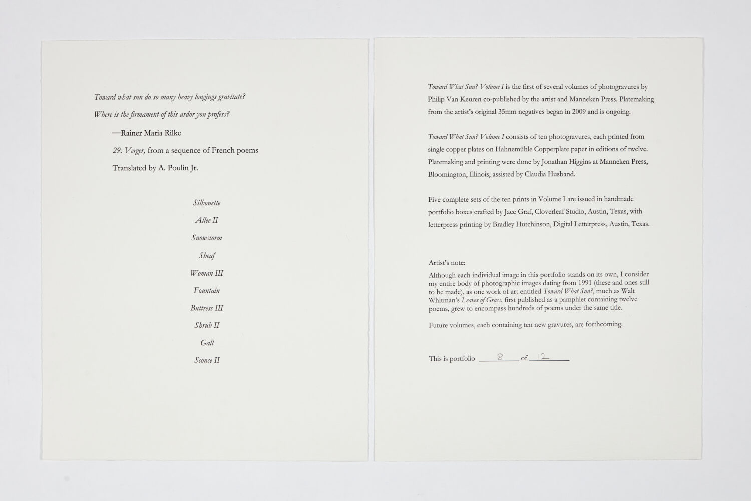 A portfolio of ten photogravures by Philip Van Keuren, with title page and colophon printed in letterpress. Housed in a silver-gray clamshell box, beautifully hand-crafted crafted by Cloverleaf Studio, with title stamped on the front cover in black ink. The photogravures are printed in editions of 12, with five complete sets reserved to be sold as portfolios. The prints, colophon and title pages are printed in black ink on Hahnemuhle Copperplate paper. Portfolio dimensions: 19 x 14 3/4 x 1 inches.