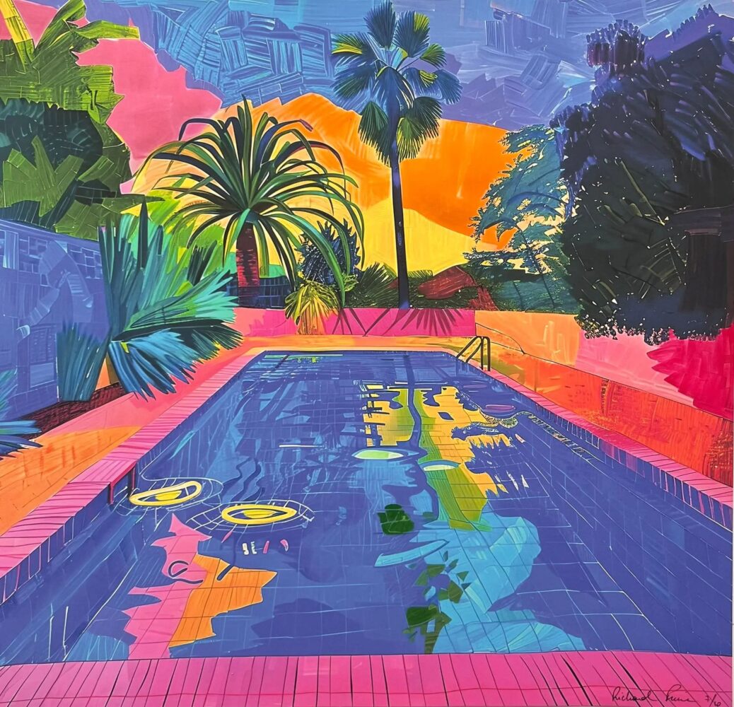 Sunburst Oasis demonstrates Richard Prince’s mastery in blending photography with conceptual art. Incorporating pools, portraits, landscapes, and natural elements, the work explores themes of identity, celebrity, and contemporary mass culture. Each hand-enhanced screenprint is meticulously crafted, capturing the essence of its subjects with sensitivity and intensity. The piece invites viewers to reflect on authenticity and representation, highlighting the complexity of the individual behind the image.