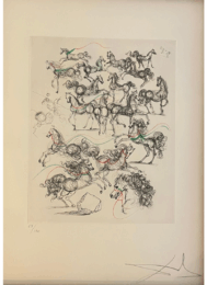 Changes in Great Masterpieces was only one of Dalí’s outstanding creations during the 1970s. In the suites Moses and Monotheism, Imagination and Objects of the Future, and Alchemy of The Philosophers, he produced some magnificent artwork. His two four-piece “puzzles,” The Rejuvenation of Time and The Puzzle of Life, are his largest lithographs. Ten Recipes of Immortality, a collection of three dimensional “pop-up” prints, is an example of how he expanded the scope of his graphic works into the third dimension. Although the 1960s may have been Dalí’s most productive decade, the 1970s appear to have been his most inventive and creative years as he explored new concepts and pushed himself even farther.