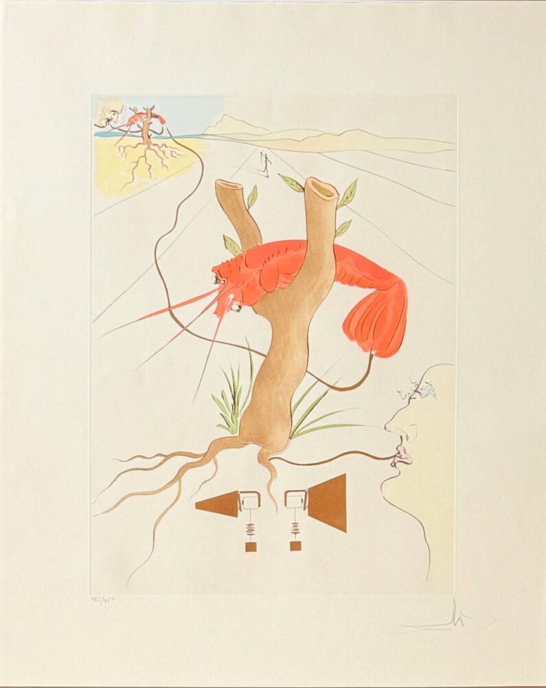 The telephone appears often in Dalí’s art. For him, it symbolized communication, connection, and sometimes desire. This print recalls his earlier Lobster Telephone, where Dalí combined humor and surrealism to surprise the viewer.