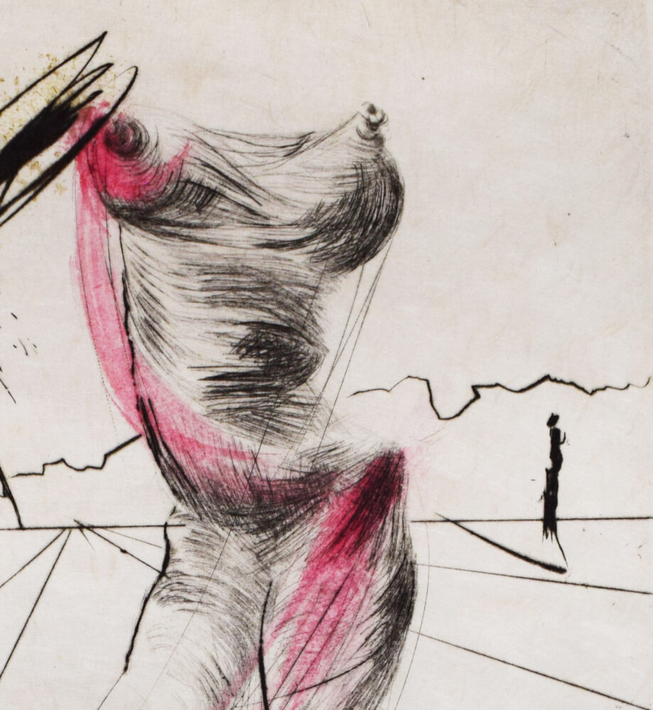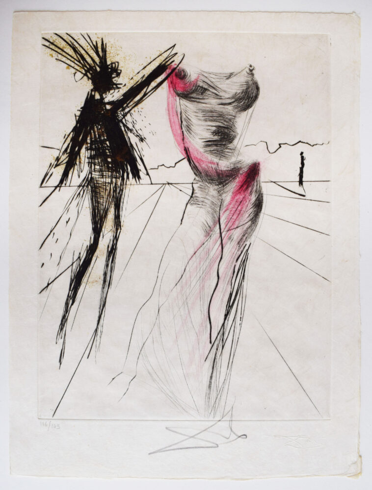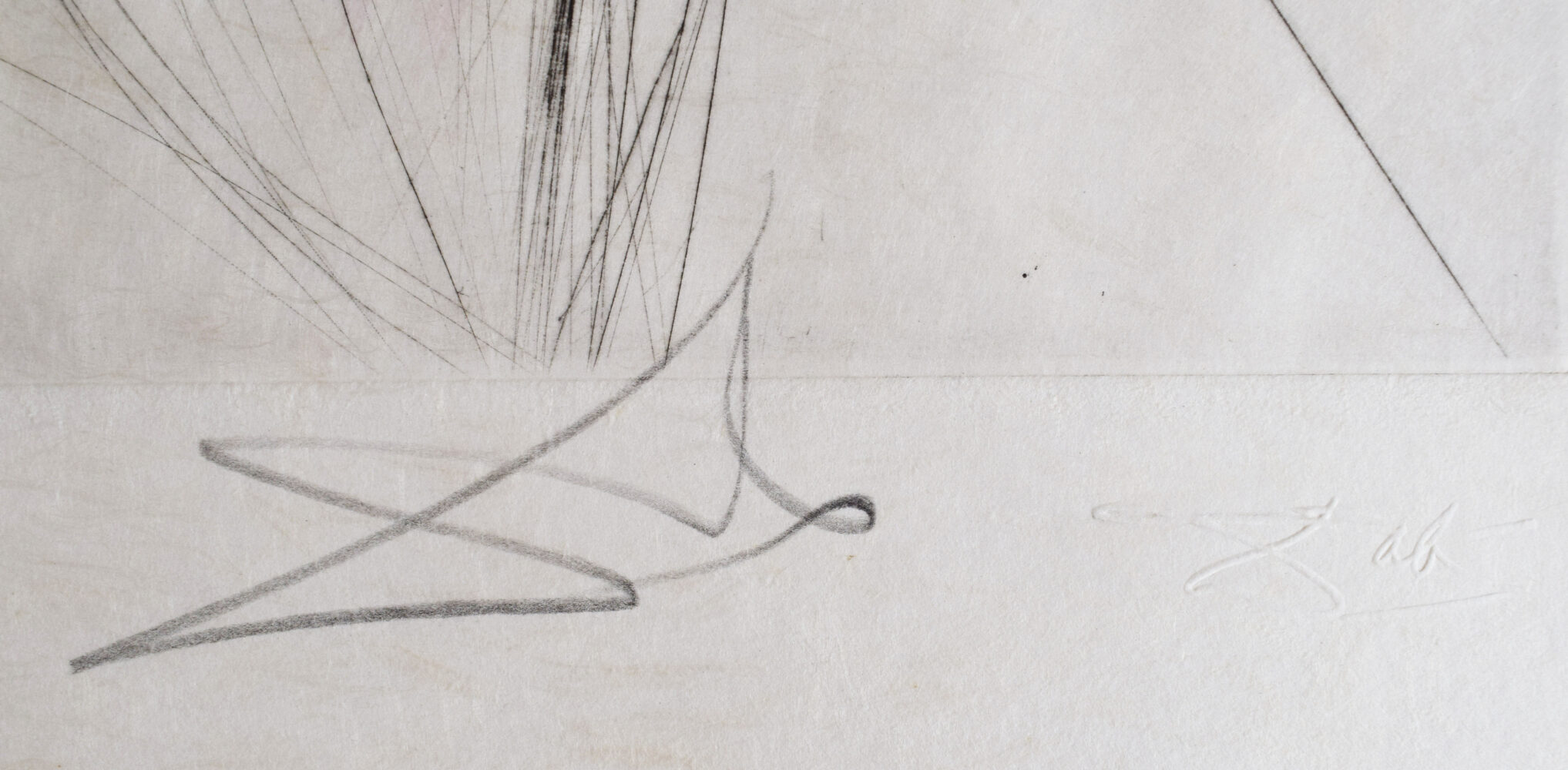 This original hand-coloured etching is hand signed in pencil by the artist “Dalí” at the lower right margin.