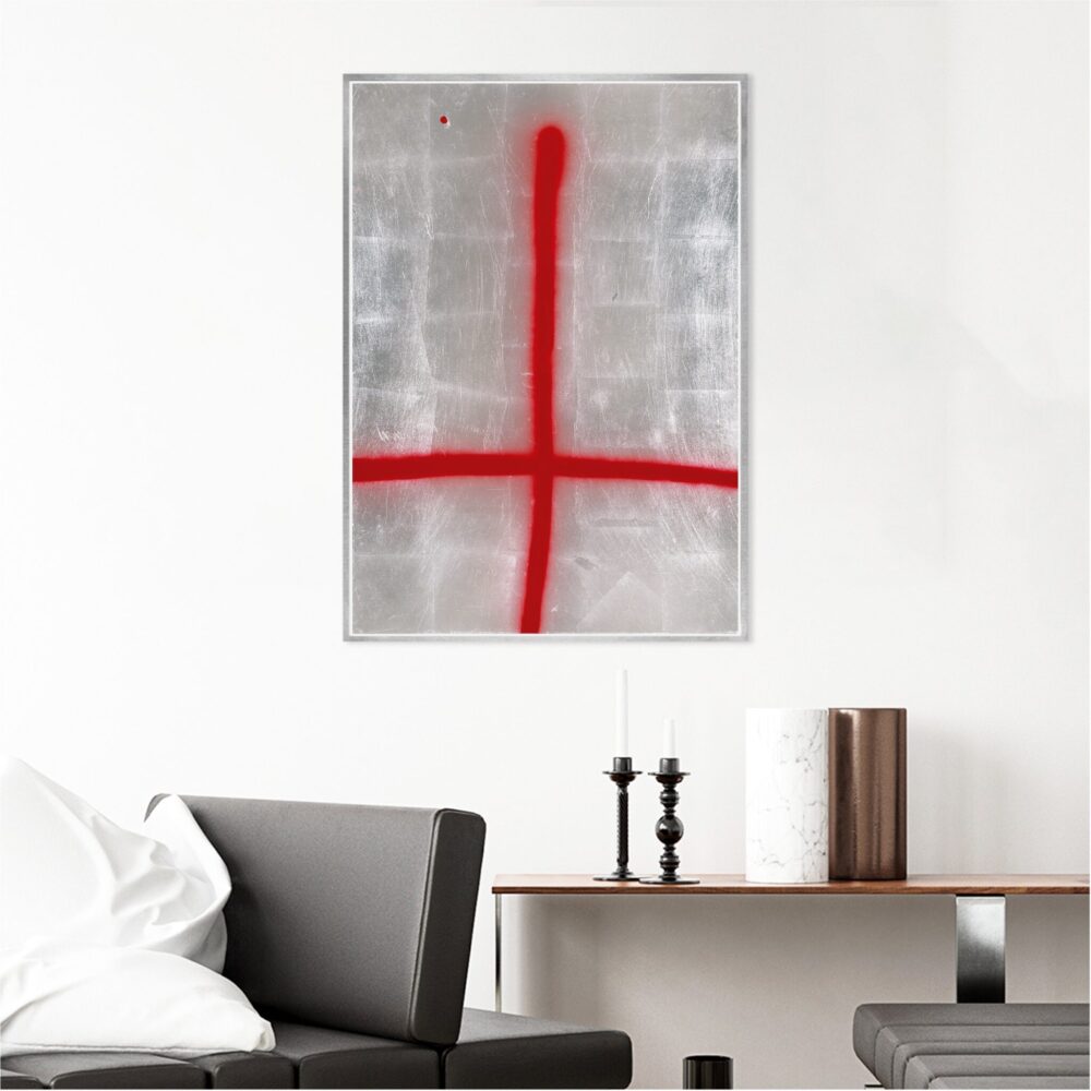 This series by German – Mexican artist combines precious metal leaf with raw spray-painted gestures. Two lines—red or black—intersect to form a cross, evoking both minimalist composition and spiritual symbolism. The contrast between refined materials and impulsive mark-making reflects a tension between faith and doubt, permanence and immediacy. Each work stands as a quiet yet powerful meditation on belief and form.