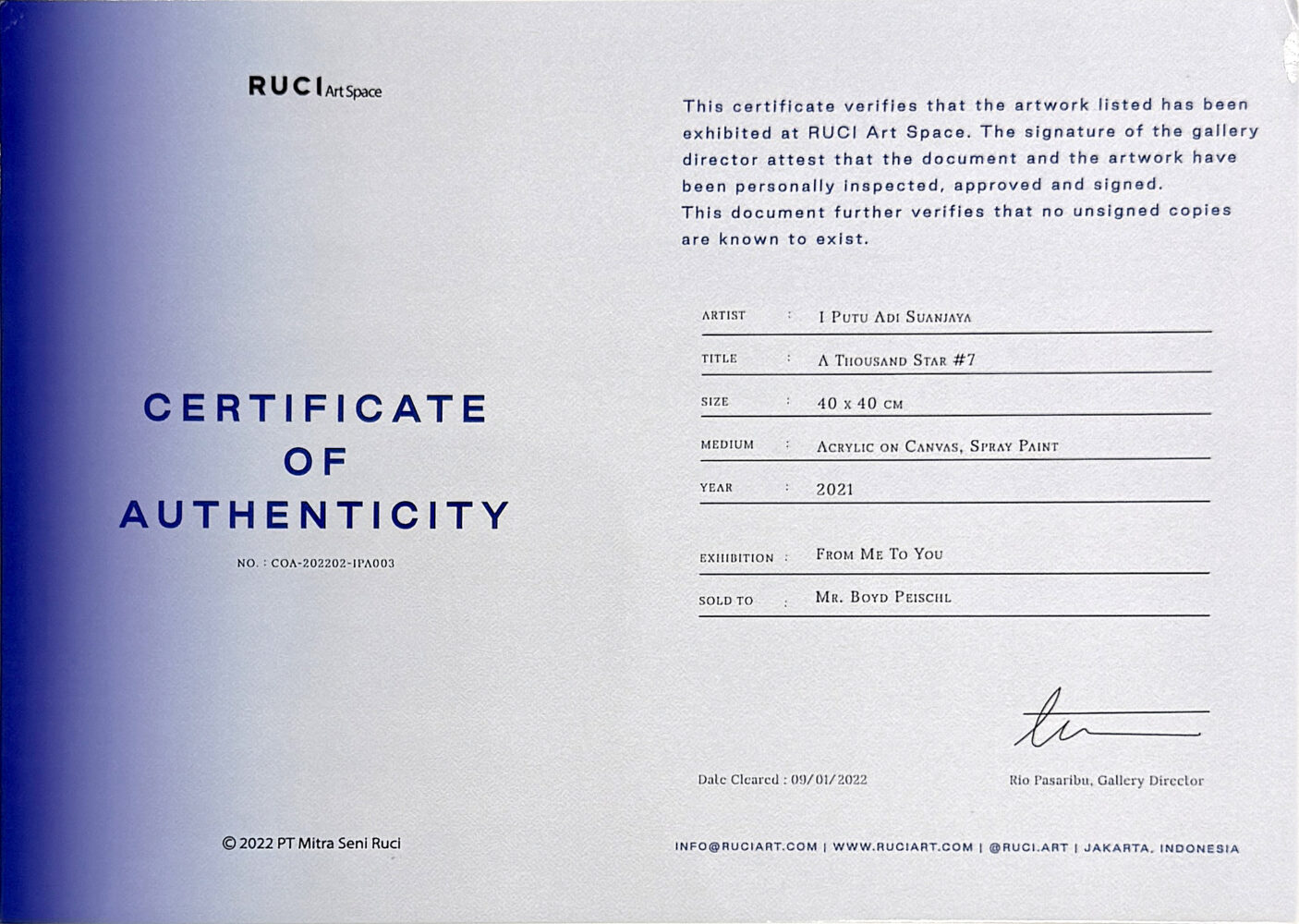 About the Artist: I Putu Adi Suanjaya, professionally known as Suanjaya Kencut (b. 1994, Badung, Bali), is an Indonesian visual artist celebrated for his vibrant paintings, sculptures, and installations. A graduate of the Indonesian Institute of the Arts, Yogyakarta (2012), Kencut merges his Balinese roots—steeped in traditional carving, ceremonial rituals, and ornate textiles—with a contemporary minimalist sensibility.