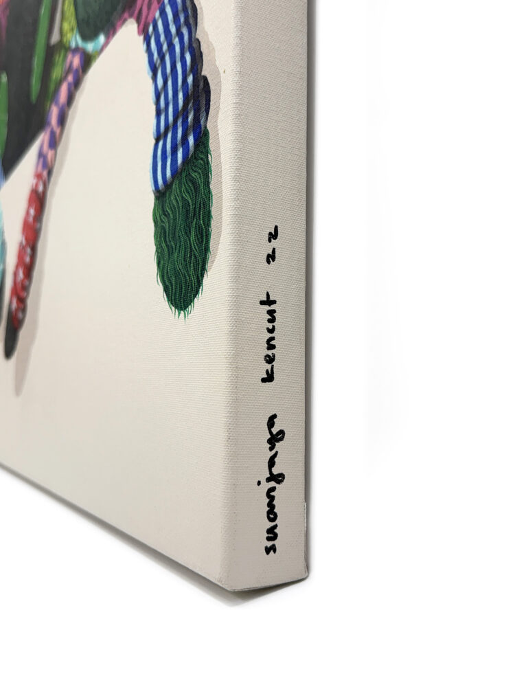 About the Artist: I Putu Adi Suanjaya, professionally known as Suanjaya Kencut (b. 1994, Badung, Bali), is an Indonesian visual artist celebrated for his vibrant paintings, sculptures, and installations. A graduate of the Indonesian Institute of the Arts, Yogyakarta (2012), Kencut merges his Balinese roots—steeped in traditional carving, ceremonial rituals, and ornate textiles—with a contemporary minimalist sensibility.