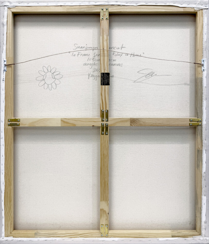 Original acrylic paint on canvas from the “In Frame Series,” which were inspired by the COVID pandemic and our hopes to reconnect with the world after a sustained period of isolation. Hand signed and dated lower right side and hand signed, titled, dated and remarqued on verso by Suanjaya Kencut. Stretched canvas size: 41 x 35.25 inches.