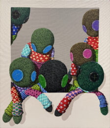 His best-known signature: expressionless dolls with button eyes, set against flat, bold, color-driven environments. These figures invite viewers to infuse their own interpretations, acting as mirrors for shared human emotions. Through rhythmic patterns and vivid hues, Kencut reimagines Balinese cultural motifs into a universal meditation on connection and empathy.