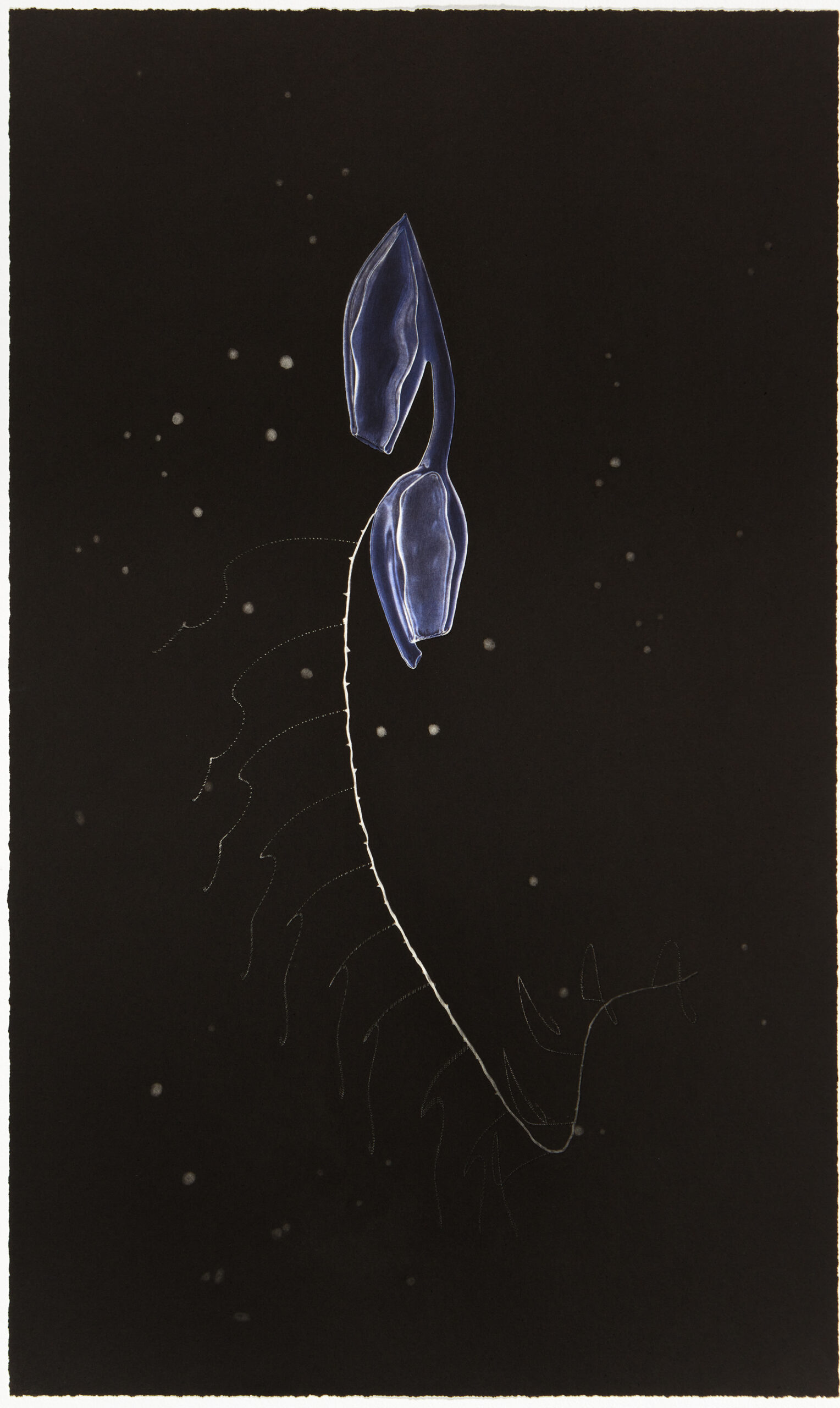 For this collaborative project, Graphicstudio accepted the artists’ challenge to create a layer of ink that would be imperceptible in daylight and glow in the dark, recreating the siphonophore from the video Vertical Migration. The Graphicstudio printers achieved a deep, dense black background with a purple glow through multiple photogravure runs. A final layer of phosphorescent screenprint ink was applied to the lighter areas of the image, mimicking the bioluminescence of the siphonophore in the deep sea. The phosphorescent ink is charged using UV light, enabling the prints to glow in the dark and interact with their surroundings, effectively replicating the appearance of these living creatures. The cover of the folio features a screenprinted title and siphonophore silhouette in partially transparent purple ink, accompanied by a text panel emphasizing the importance of these marine organisms.