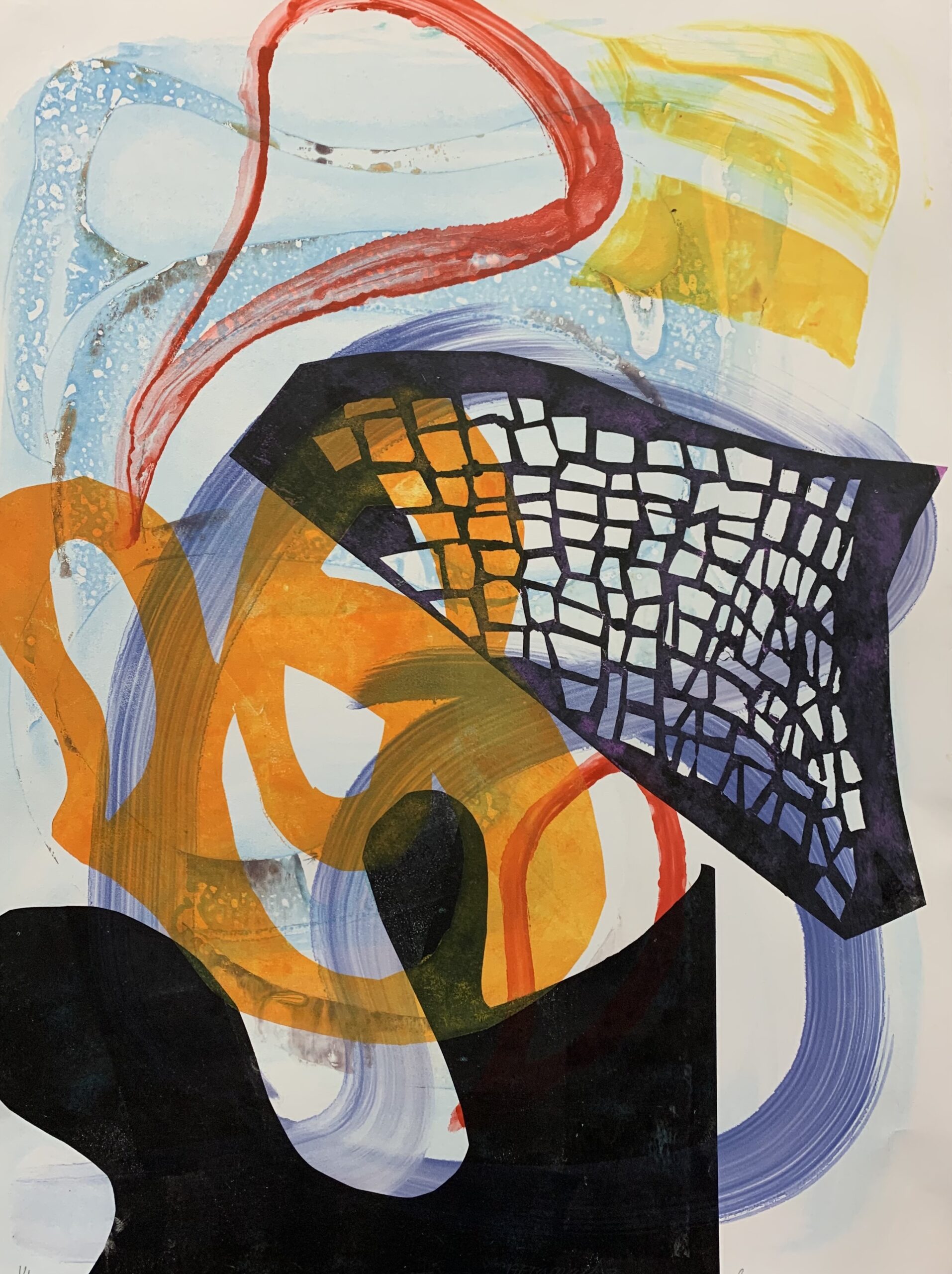 A modern graphic, visually exciting monoprint with reference to biomorphic and modernist abstract forms.