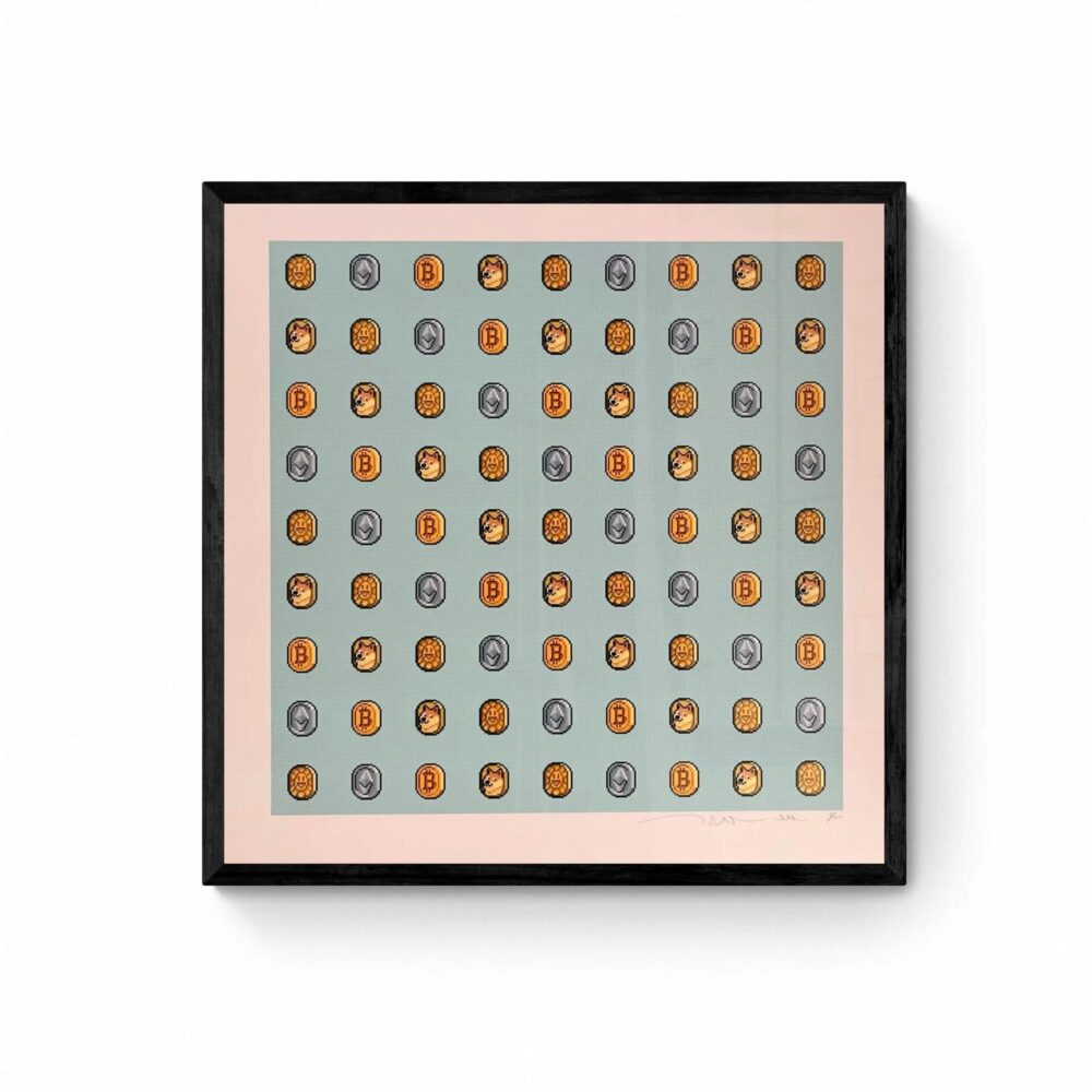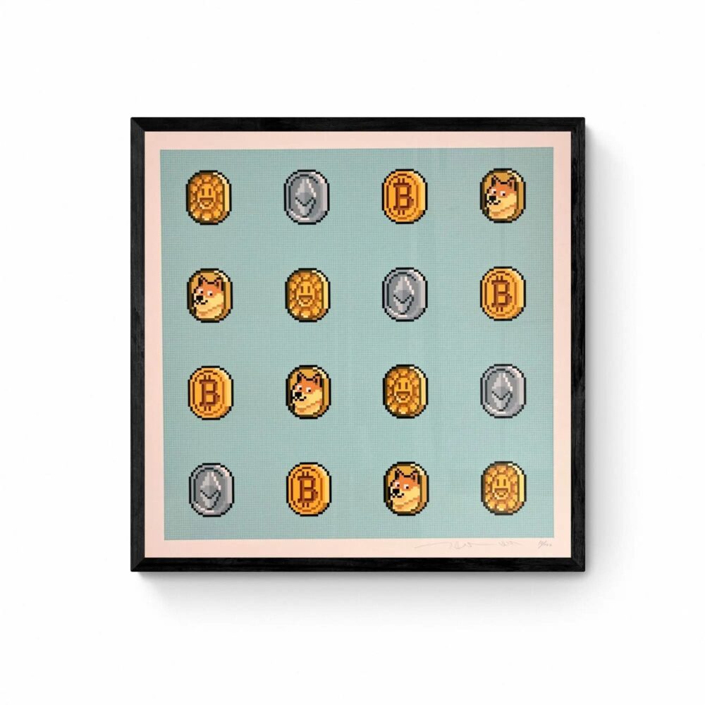 Description: This set of two screen prints, 4 x 4 Coin and other Cryptocoins and 9 x 9 Coin and other Cryptocoins, reflects Takashi Murakami’s vibrant and contemporary universe. Created as screen prints on fine art paper, these works explore modern themes of cryptocurrencies in a distinctive and colorful style.