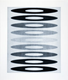In Ted Kincaid’s “Nest” prints, sinuous, lyrical, gyrating lines coalesce into structures that are simultaneously organic and digital.  These systemic forms seem random yet have an implied symmetry.  Alluding to elements in nature – hinting at smoke, liquids or rhizomes – they proclaim their origins as computer drawings while comfortably inhabiting the traditional medium of line etching.