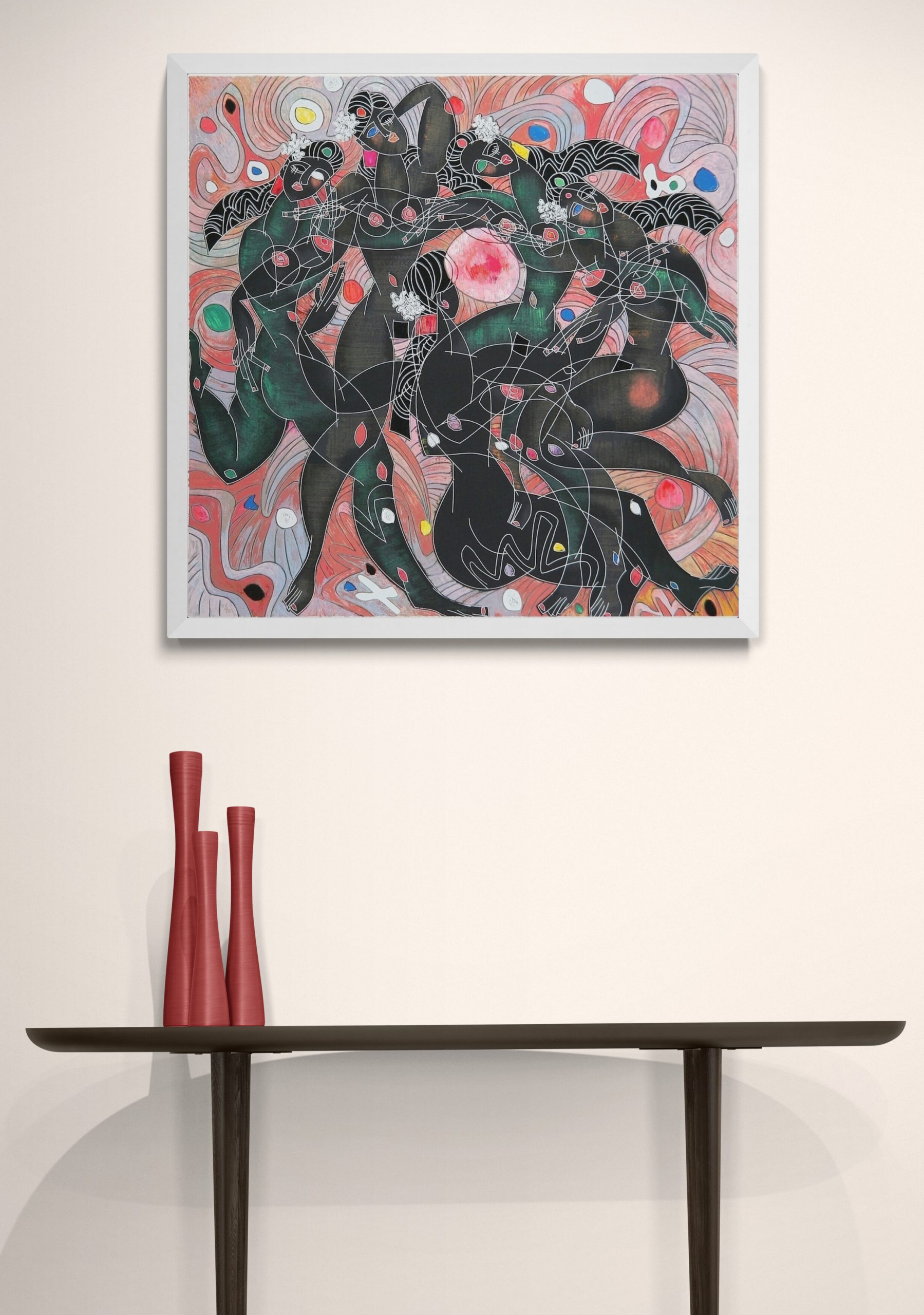 Arty-Fact: Jiang’s visual style is instantly recognisable by its combination of vibrant colours, abstract elements and patterns, and more figurative motifs including animals and the female nude. He has described his paintings as “not only pictures”, but “also music and poetry that is bewitching, sweet dreams that are being dreamed.”