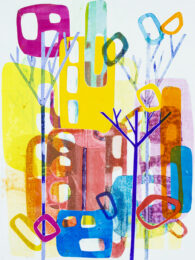 “My work is based on the study of forms, shapes and lines in a spatial atmosphere that I intuitively express as colorful abstract paintings or prints. The lines allow me to explore spaces as they dance and spin and the colors and textures create depths to examine. My work is lyrical and elusive, inviting the viewer to delve into my inner world.” – MR