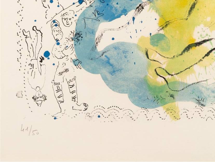Created in 1969 and printed by Fernand Mourlot, Lumière du cirque belongs to a celebrated cycle of circus lithographs in which Chagall’s lifelong fascination with acrobats, clowns, and musicians reaches lyrical maturity. Beneath their luminous colours lies a profound empathy for the performers — figures who, suspended between gravity and flight, embody the fragile balance between laughter and melancholy. The glowing reds and yellows evoke the warmth of the spotlight, while the sweeping arcs of blue recall the infinite expanse of dream and memory.