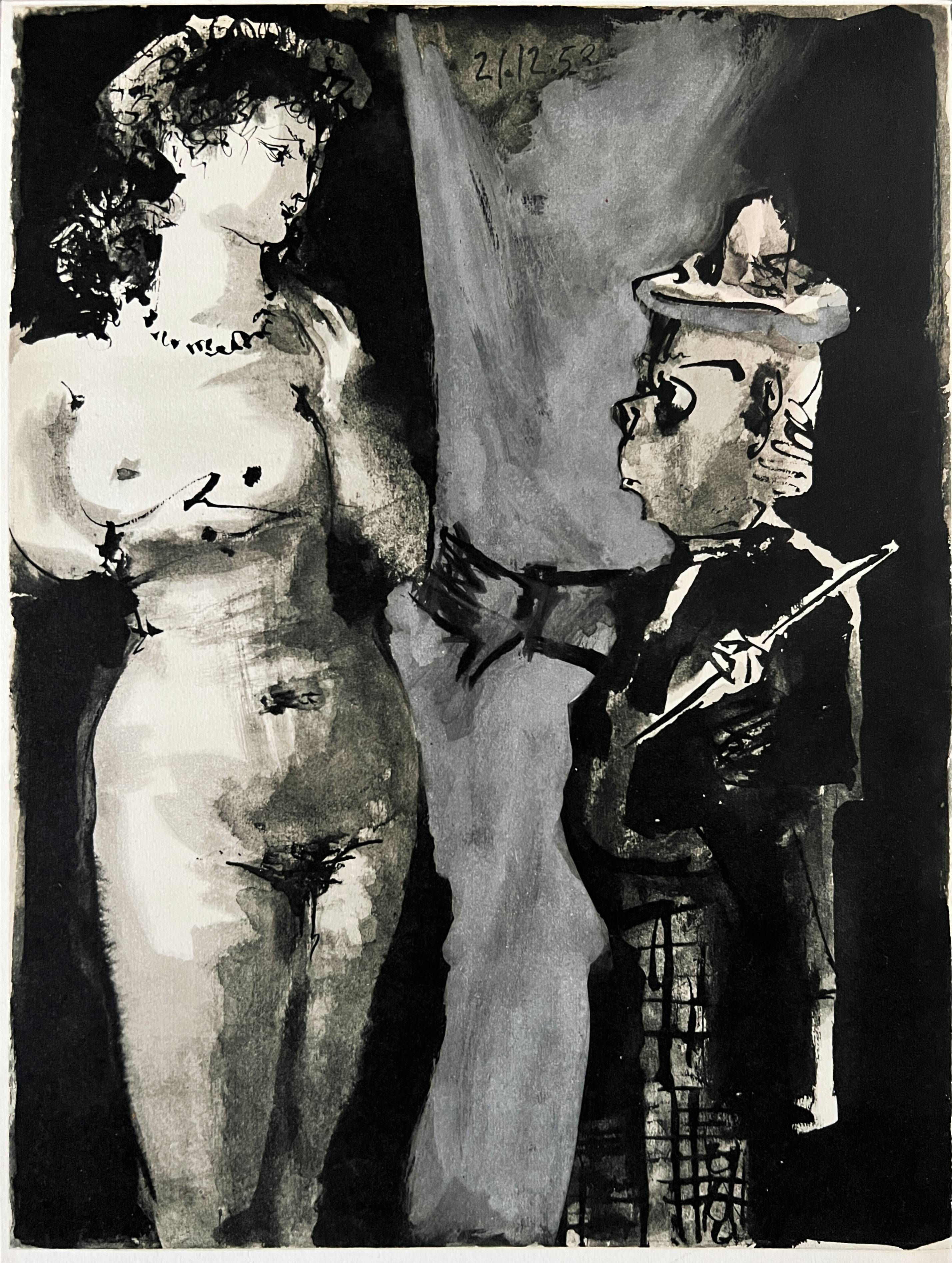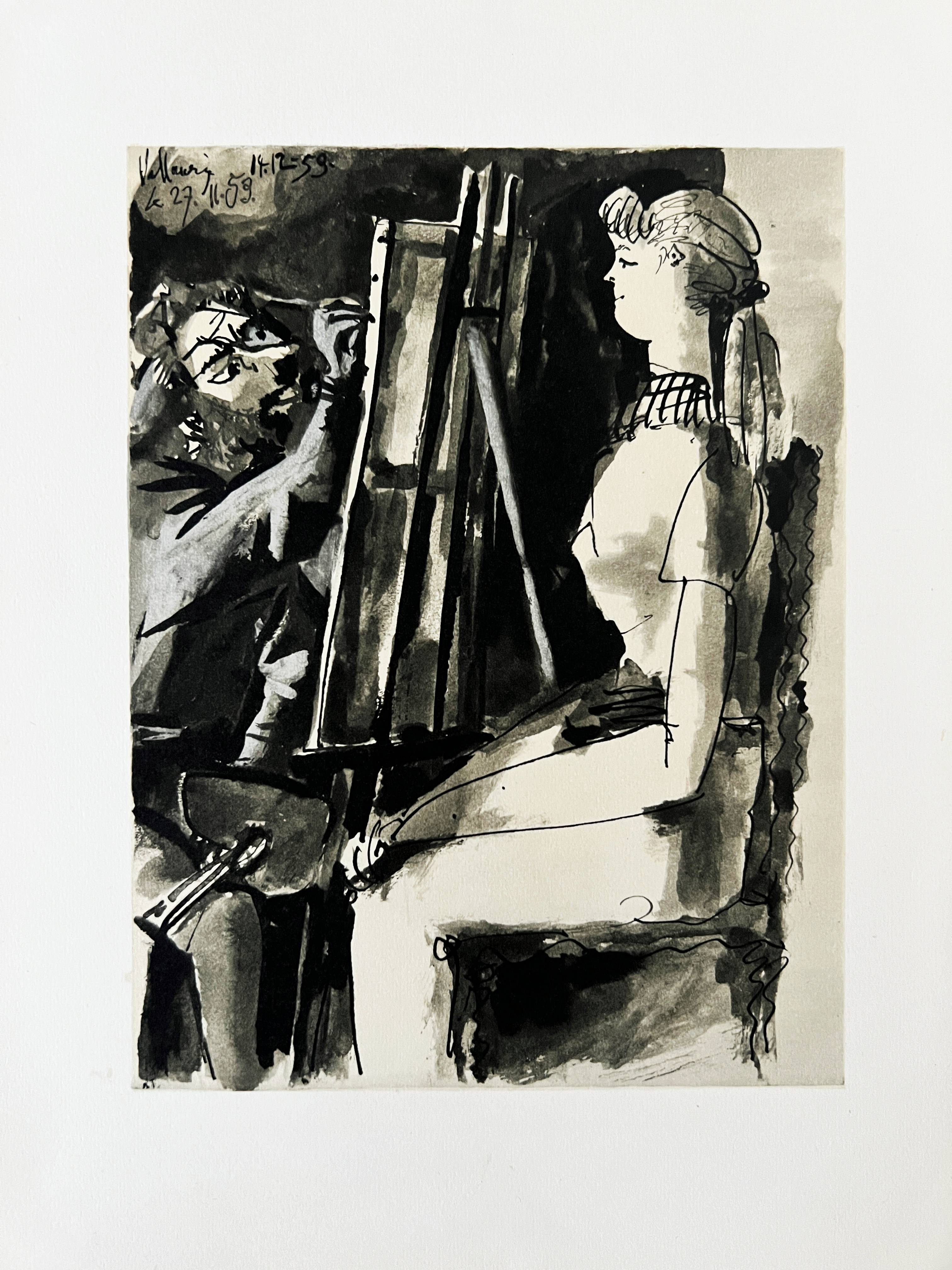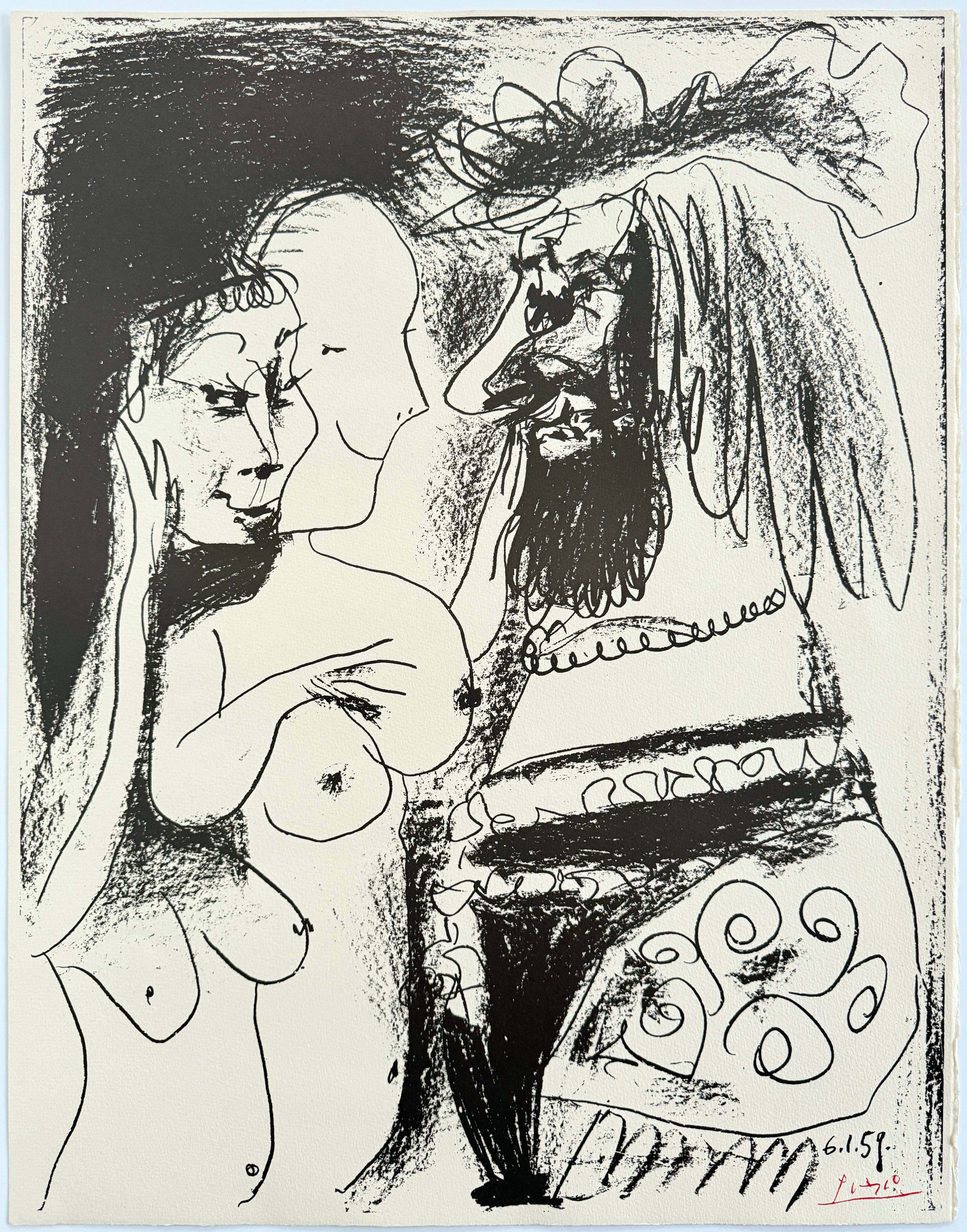 It all began when Fernand Mourlot, Picasso’s trusted printer and longtime collaborator, visited him at his home in Mougins. Mourlot brought with him sheets of lithographic transfer paper—light, portable surfaces on which Picasso could draw directly with special crayons and inks. Rather than using them for preparatory sketches or carefully planned compositions, Picasso leapt into action. Almost daily over a few weeks, he created image after image, sometimes several in a single sitting. By March, he had completed 29 striking lithographs.