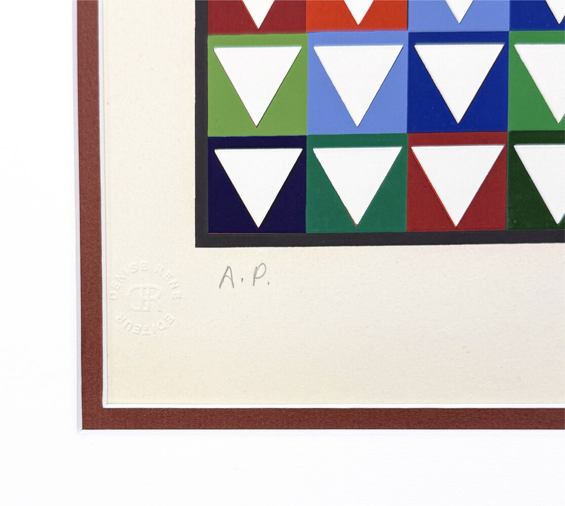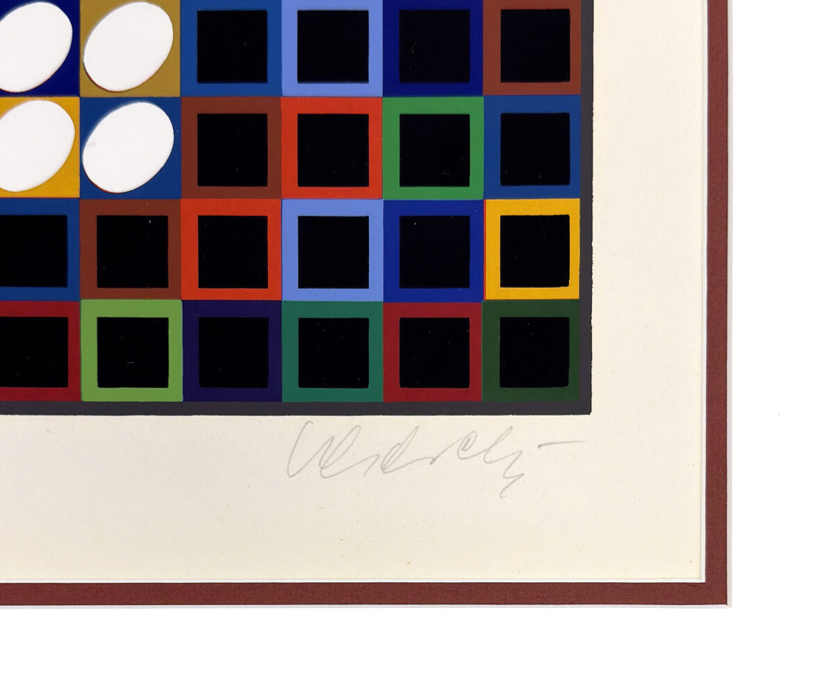 Serigraph in colors on paper. Hand signed lower right by Victor Vasarely. Hand numbered AP lower left (there is also a main edition of 300). Sheet size: 26 x 25.5 inches. Image size: 21 x 19.875 inches. Frame size: 30.5 x 29 inches.