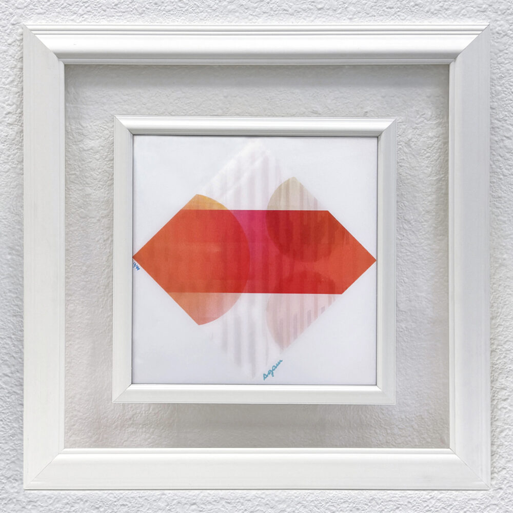 Agamograph (3D lenticular). Hand signed lower front by Yaacov Agam. Hand numbered 13/99 front left. Custom framed as pictured. Plexiglass sandwich style with white frame. Frame size: 26 x 26 inches inches.
