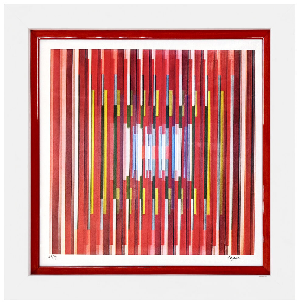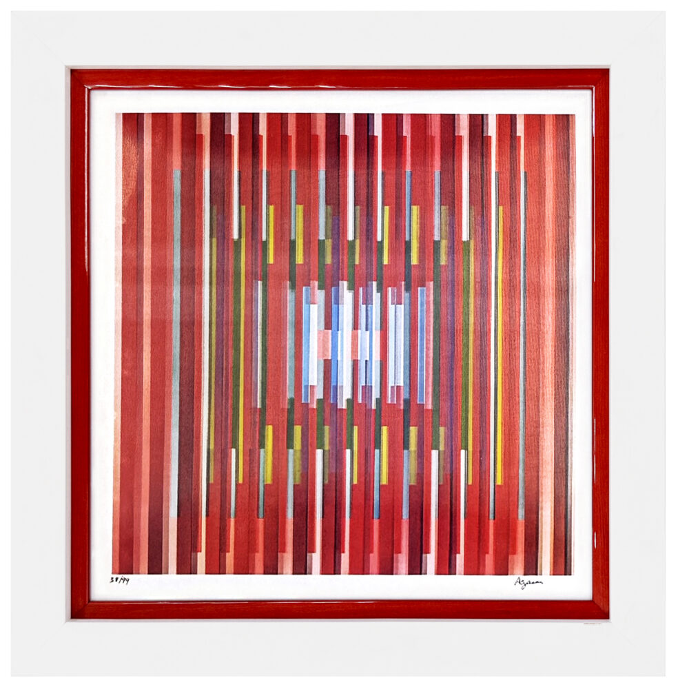 Agamograph (3D lenticular). Hand signed lower right by Yaacov Agam. Hand numbered 38/99 lower left. Artwork size 14.25 x 14 inches. Custom framed as pictured. Frame size: 17.9 x 17.6 inches.