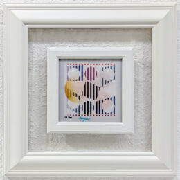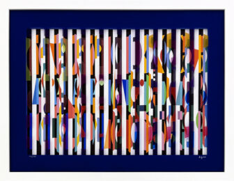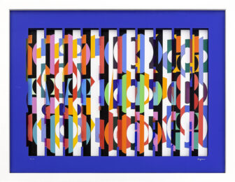 About the Artist: Yaacov Agam (Israeli, born 1928) is best known for his pioneering of Kinetic Art. Employing light and sound to provide a unique sensorial experience for the viewer, Agam melded formalism and mysticism. His lenticular prints, or Agamographs, made illusory images appear depending on the audience’s viewpoint. “My intention was to create a work of art which would transcend the visible, which cannot be perceived except in stages, with the understanding that it is a partial revelation and not the perpetuation of the existing,” he explained of his work. “My aim is to show what can be seen within the limits of possibility which exists in the midst of coming into being.” Born Yaacov Gipstein on May 11, 1928 in Rish-le-Zion, Palestine (now Israel), Agam studied in Jerusalem, Zürich, and Paris. While attending Zürich’s Kunstgewerbe Schule, Agam studied under the renowned color theorist Johannes Itten, before moving to Paris in 1951. Agam has gone on to become the subject of retrospectives at the Musée National d’Art Moderne in Paris in 1972, and the Solomon R. Guggenheim Museum in New York in 1980. The artist currently lives and works in Paris, France. His works are included in the collections of The Museum of Modern Art in New York, the Hirshhorn Museum and Sculpture Garden in Washington, D.C., and the Santa Barbara Museum of Art, among others.