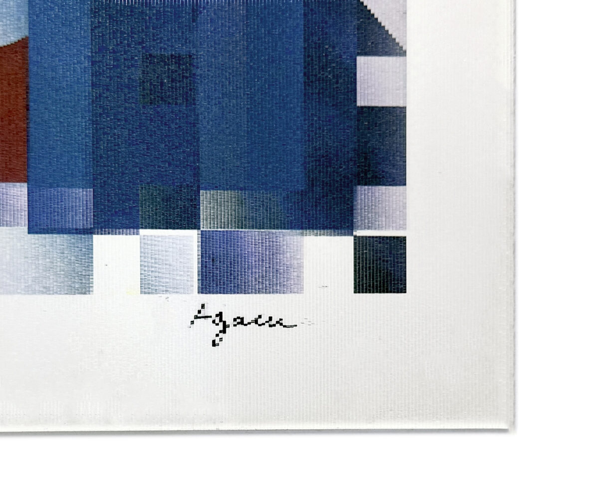 Agamograph (3D lenticular). Hand signed lower right by Yaacov Agam. Hand numbered 39/99 lower left. Artwork size 14.25 x 14 inches. Custom framed as pictured. Frame size: 17.75 x 17.62 inches.