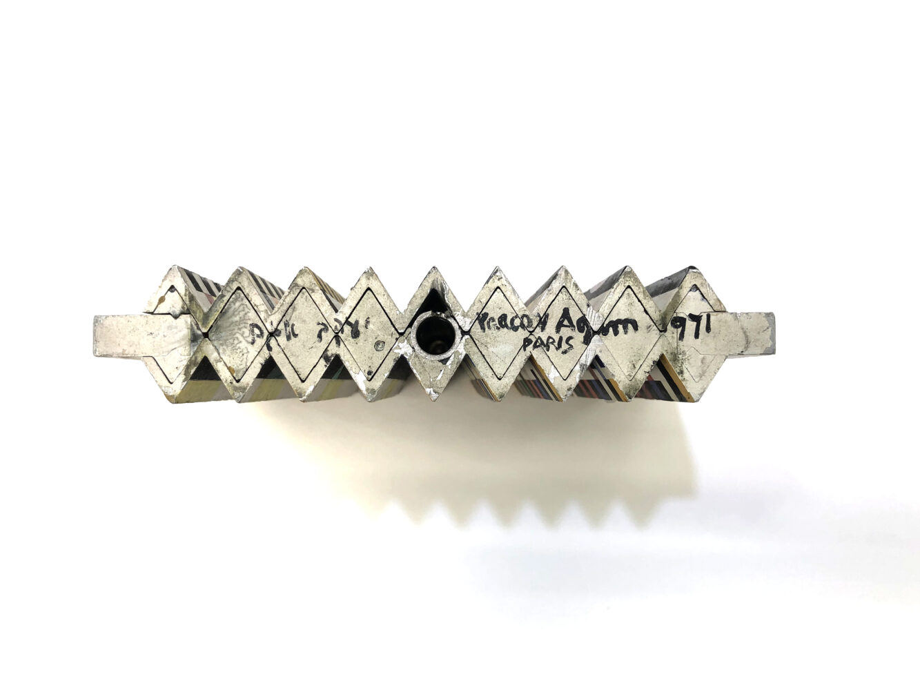 Original oil painting on metal double sided spinning polymorph kinetic sculpture. Artwork size: 3.8 x 5 x 1 inches. Hand signed and dated on the underside by Yaacov Agam.