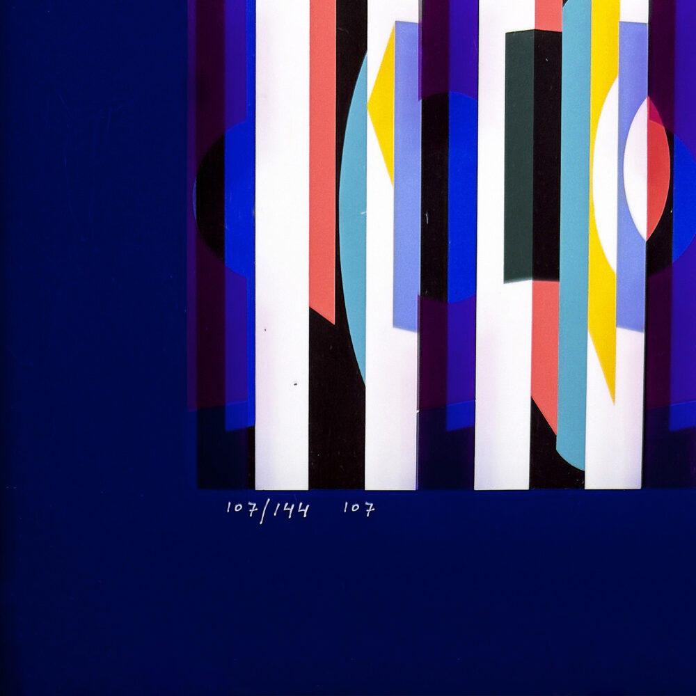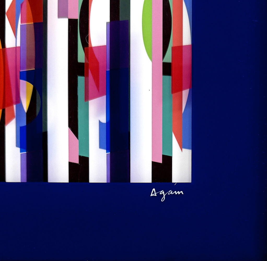 About the Artist: Yaacov Agam (Israeli, born 1928) is best known for his pioneering of Kinetic Art. Employing light and sound to provide a unique sensorial experience for the viewer, Agam melded formalism and mysticism. His lenticular prints, or Agamographs, made illusory images appear depending on the audience’s viewpoint. “My intention was to create a work of art which would transcend the visible, which cannot be perceived except in stages, with the understanding that it is a partial revelation and not the perpetuation of the existing,” he explained of his work. “My aim is to show what can be seen within the limits of possibility which exists in the midst of coming into being.” Born Yaacov Gipstein on May 11, 1928 in Rish-le-Zion, Palestine (now Israel), Agam studied in Jerusalem, Zürich, and Paris. While attending Zürich’s Kunstgewerbe Schule, Agam studied under the renowned color theorist Johannes Itten, before moving to Paris in 1951. Agam has gone on to become the subject of retrospectives at the Musée National d’Art Moderne in Paris in 1972, and the Solomon R. Guggenheim Museum in New York in 1980. The artist currently lives and works in Paris, France. His works are included in the collections of The Museum of Modern Art in New York, the Hirshhorn Museum and Sculpture Garden in Washington, D.C., and the Santa Barbara Museum of Art, among others.