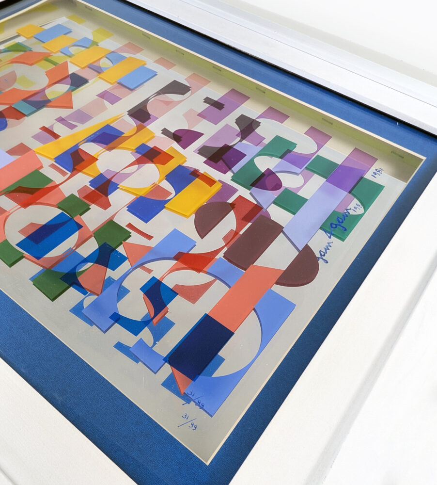 Interspaceograph – multidimensional silkscreen print on plexiglass pane and mirror. There is space between the silkscreen printed plexiglass pane and silkscreen printed mirror in the custom frame giving the artwork a multidimensional look. Hand signed and dated on the right by Yaacov Agam. Hand numbered 31/99 lower right. Artwork size: 15.5 x 20 inches. Frame size: 19.75 x 24 x 2 inches.