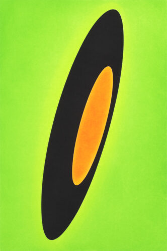 This work depicts five different colours of red printed on stenciled areas of yellow acrylic paint.